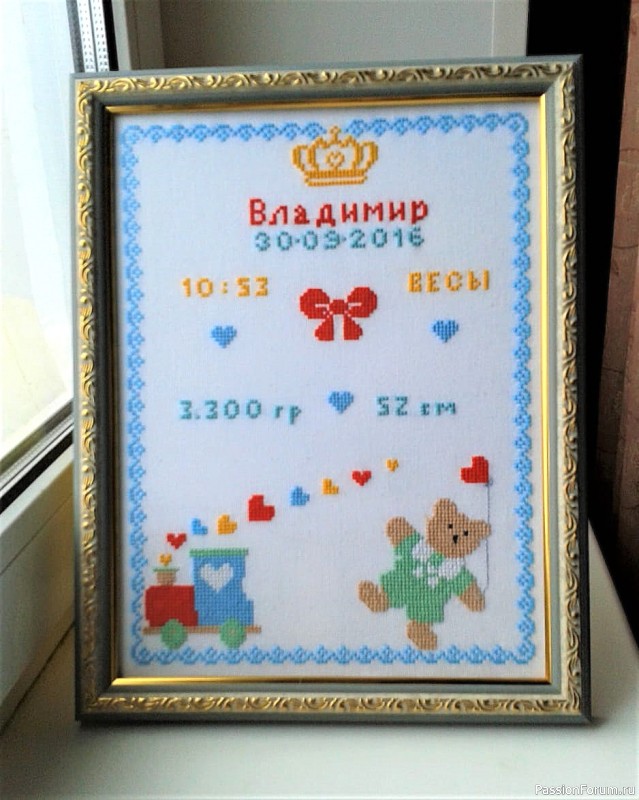 Люба! Хорошо, что вспомнили про свою вышивку. Нежная, аккуратная, гармонично оформленная работа. Корона отлично вписалась, кроме того это символ, быть Владимиру королем по жизни, лидером, с царем в голове...