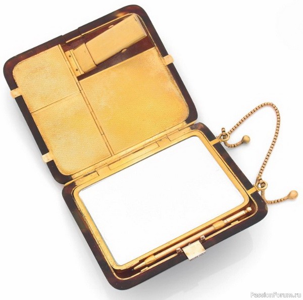 В косметичках такой конструкции отделение для пудры, румян и зеркала соединено цепочкой с футляром для помады.