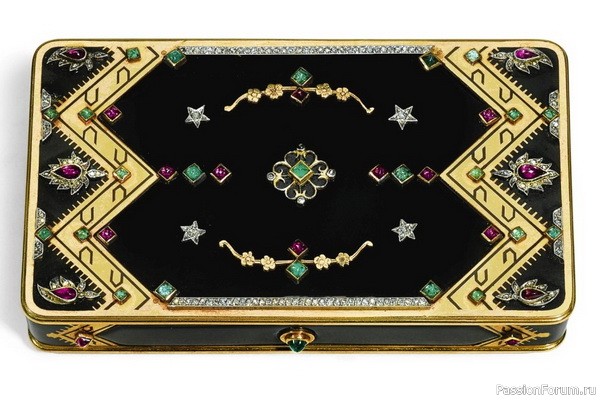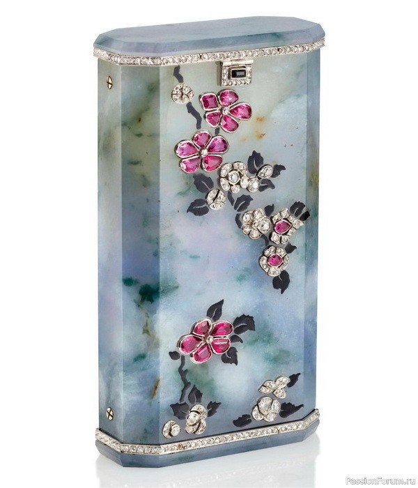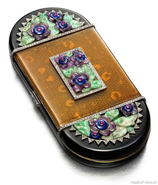 Косметичка из золота с эмалью, украшенная резными аметистами, жадеитом, лазуритом, рубинами и бриллиантами, длина 9,5 см, Van Cleef & Arpels, 1926 г., из коллекции принца Садруддина Ага Хана.