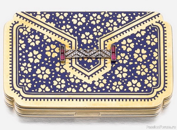 Золотая косметичка с эмалевым узором, украшенная рубинами и бриллиантами, длина 7,1 см, Strauss, Allard & Meyer для Lacloche Frères, около 1925 г.