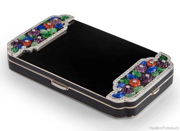 Косметичка, украшенная эмалью, бриллиантами и цветочными мозаиками из аметиста, коралла, лазурита и нефрита, Strauss, Allard & Meyer для Cartier, около 1925 г.