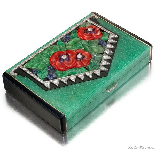 Косметичка «Маки» из авантюрина, украшенная мозаичным цветочным панно из коралла, жадеита, аметиста, сапфиров и бриллиантов, длина 8,4 см, Strauss, Allard & Meyer для Janesich, около 1928 г., из коллекции принца Садруддина Ага Хана.