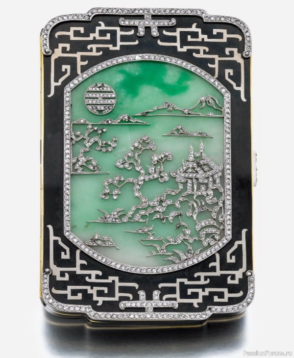 , мой фаворит. А еще впечатлила информация на одной из коробочек: "Косметичка из золота и позолоченного серебра, отделанная лаком и мозаикой из яичной скорлупы, украшенная резным жадеитом, 5,7х7,7 см, Straus Allard et Meyer, около 1925 г."