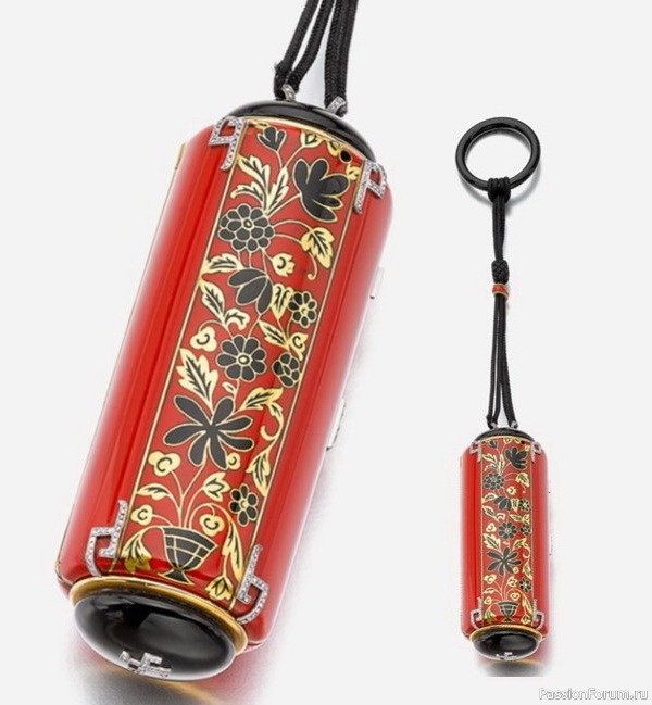 Золотая косметичка в виде валика на шелковом шнуре, украшенная ониксом, эмалью и бриллиантами, длина 9,5 см, Straus Allard et Meyer для Lacloche Frères, около 1925 г. Косметичка имеет два отделения с зеркалом, золотой карандаш и блокнот.