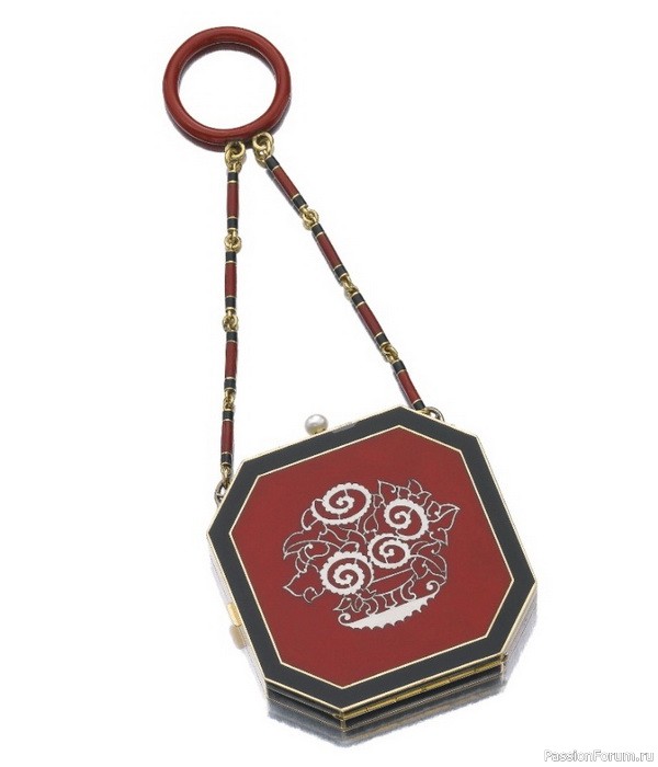 Косметичка с цветочным мотивом из золота, украшенная красным и черным лаком и жемчугом, 5х5 см, Strauss, Allard & Meyer, около 1920 г.