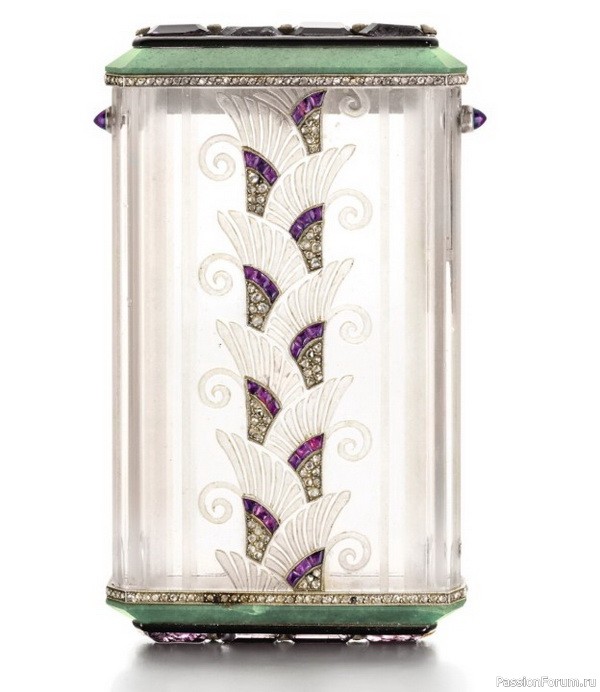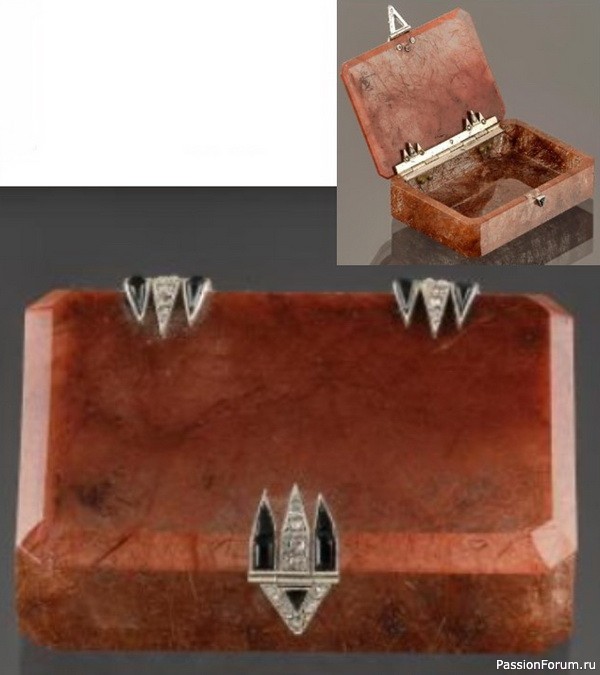 Портсигар из резного кварца и авантюрина в оправе из платины с аметистами и бриллиантами, высота 9 см, Straus Allard et Meyer, около 1925 г.