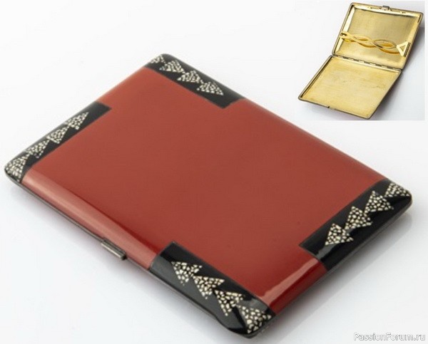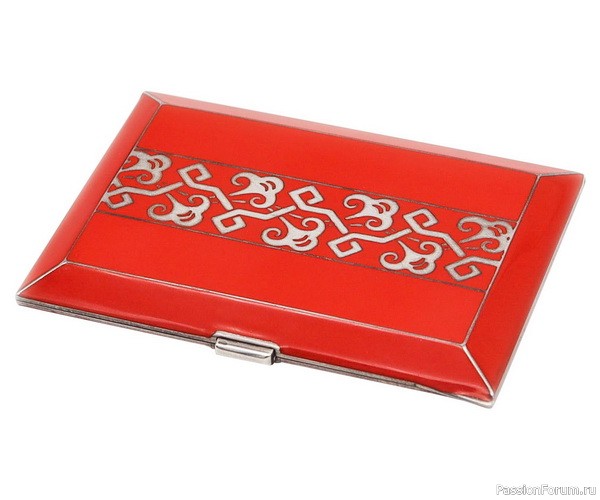Портсигар из серебра, украшенный красно-оранжевой эмалью с геометрическими мотивами в стиле шинуазри, длина 8,7 см, Straus Allard et Meyer для George Stockwell, около 1926 г.
