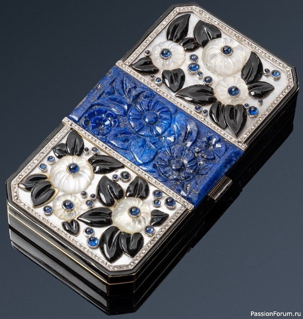 Косметичка из золота с эмалью, украшенная цветочным мотивом из лазурита, лунного камня, оникса, перламутра, сапфиров и бриллиантов, длина 8 см, Strauss, Allard & Meyer для VanCleef & Arpels, около 1925 г.