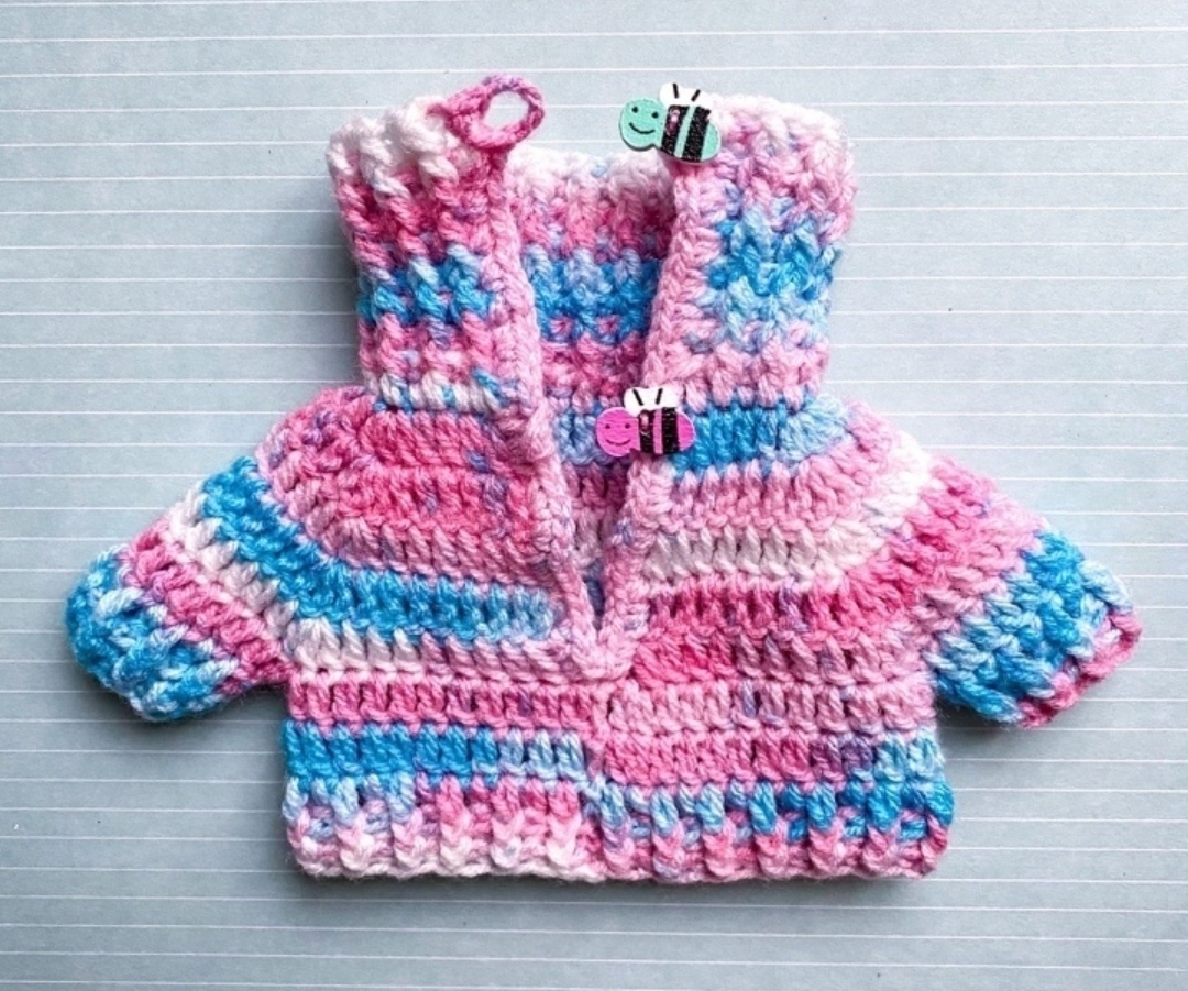 В конце вязания нить не обрываем! Нужно обвязать вырез на спинке. На одной стороне не забываем вывязать петельки для пуговок. Справа вырез обвязываем столбиками без накида, а слева делаем петельки из цепочек по пять воздушных петель. Одна петелька будет на стыке между горлом и началом спинки, а вторая на самом верху горла. Прячем нить.
