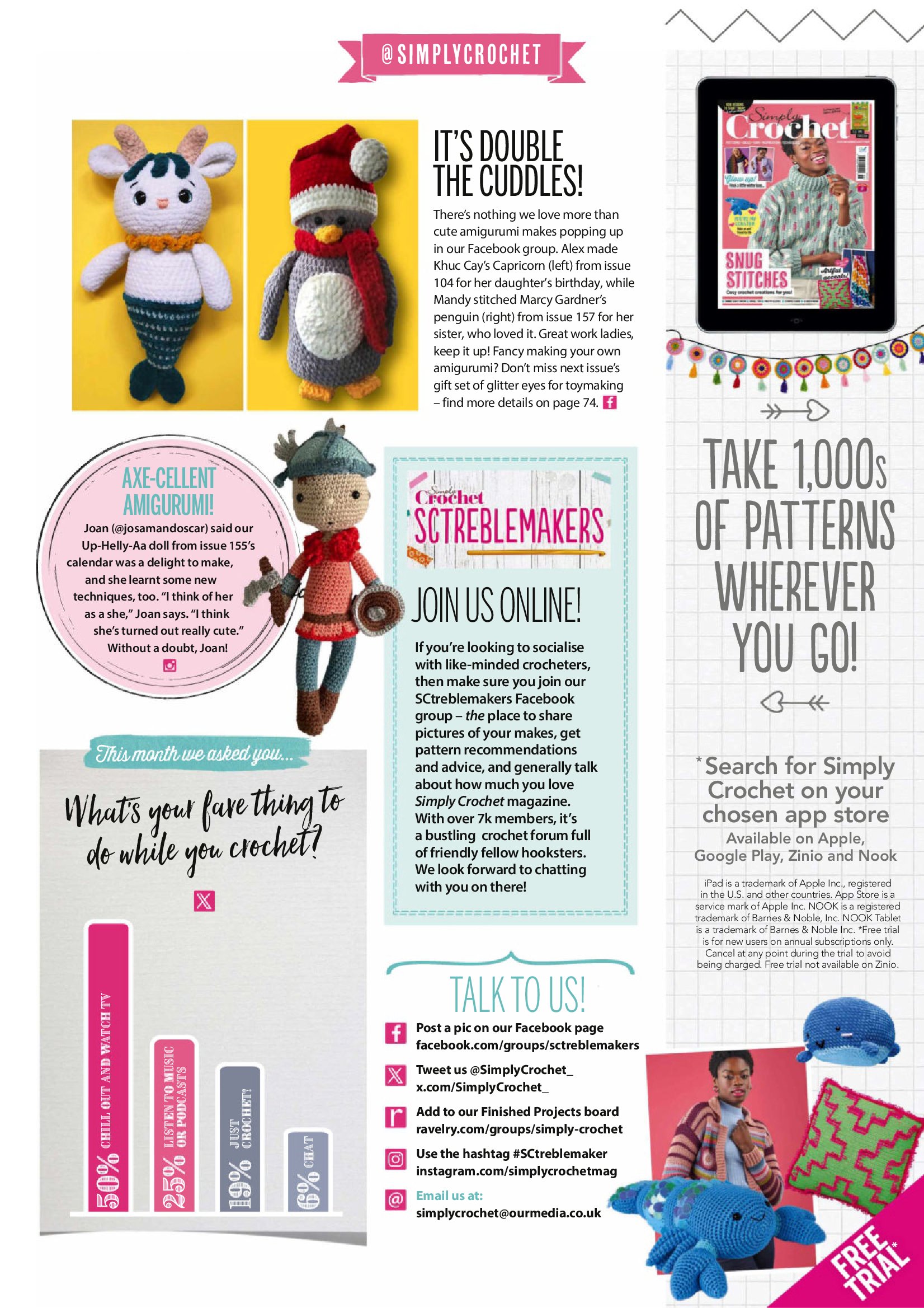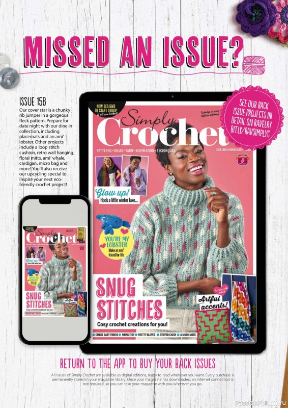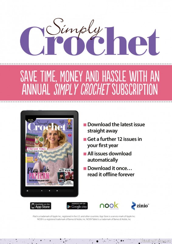 Журнал "Simply Crochet" посвящён вязанию крючком. В каждом выпуске этого журнала представлены проекты для вязания моделей одежды для взрослых и детей, аксессуаров, игрушек, предметов интерьера для дома.