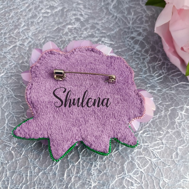 Брошь «Пион» выполнена из пайеток, жемчуга, бисера, вискозные нитки, кристаллы. Изнанка натуральная замша.