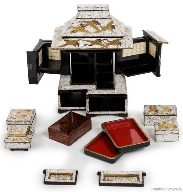 Чайный домик, настоящее миниатюрное сокровище, имеет несколько отделений, шкатулок и подносов, стены открываются с помощью оловянной застежки.