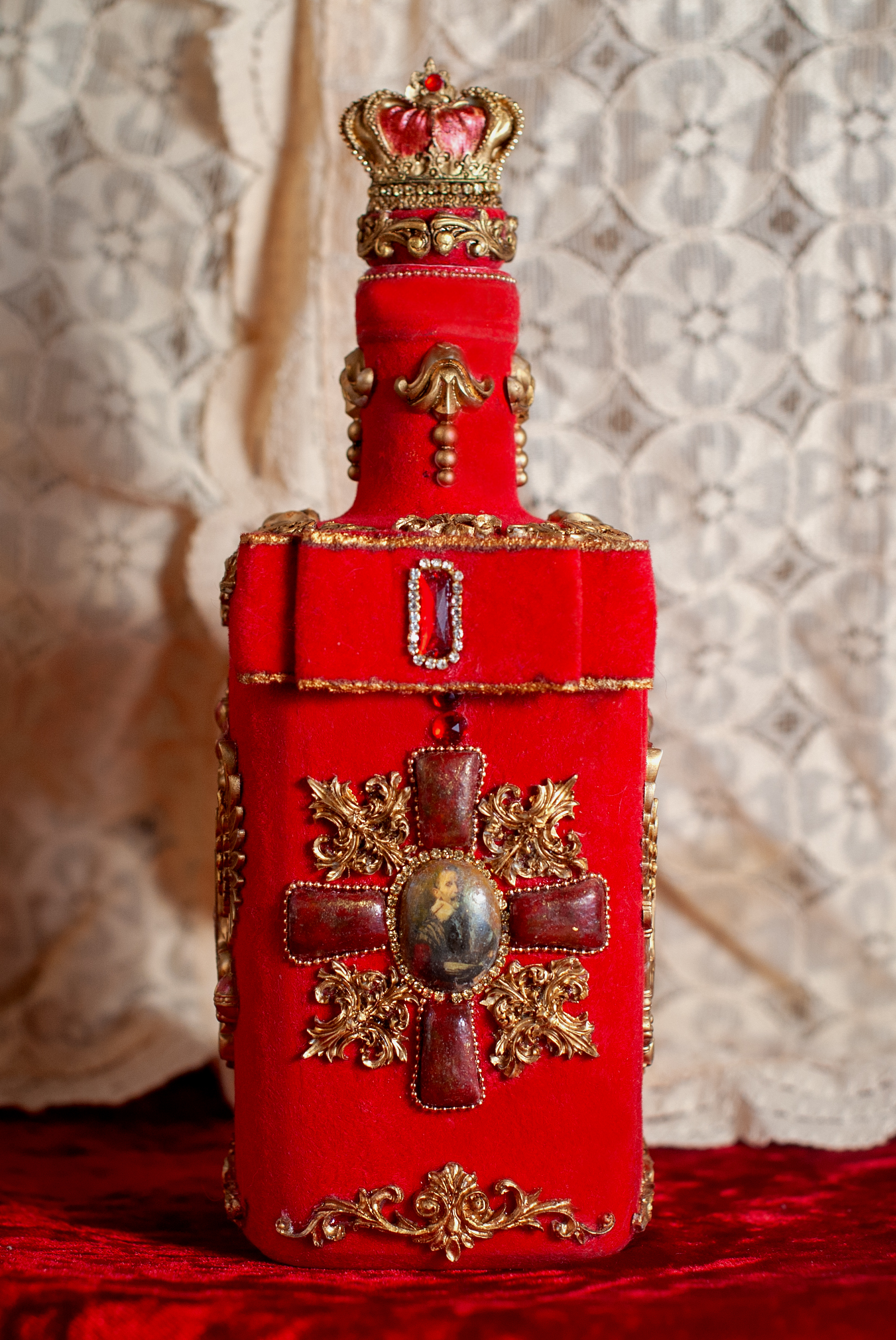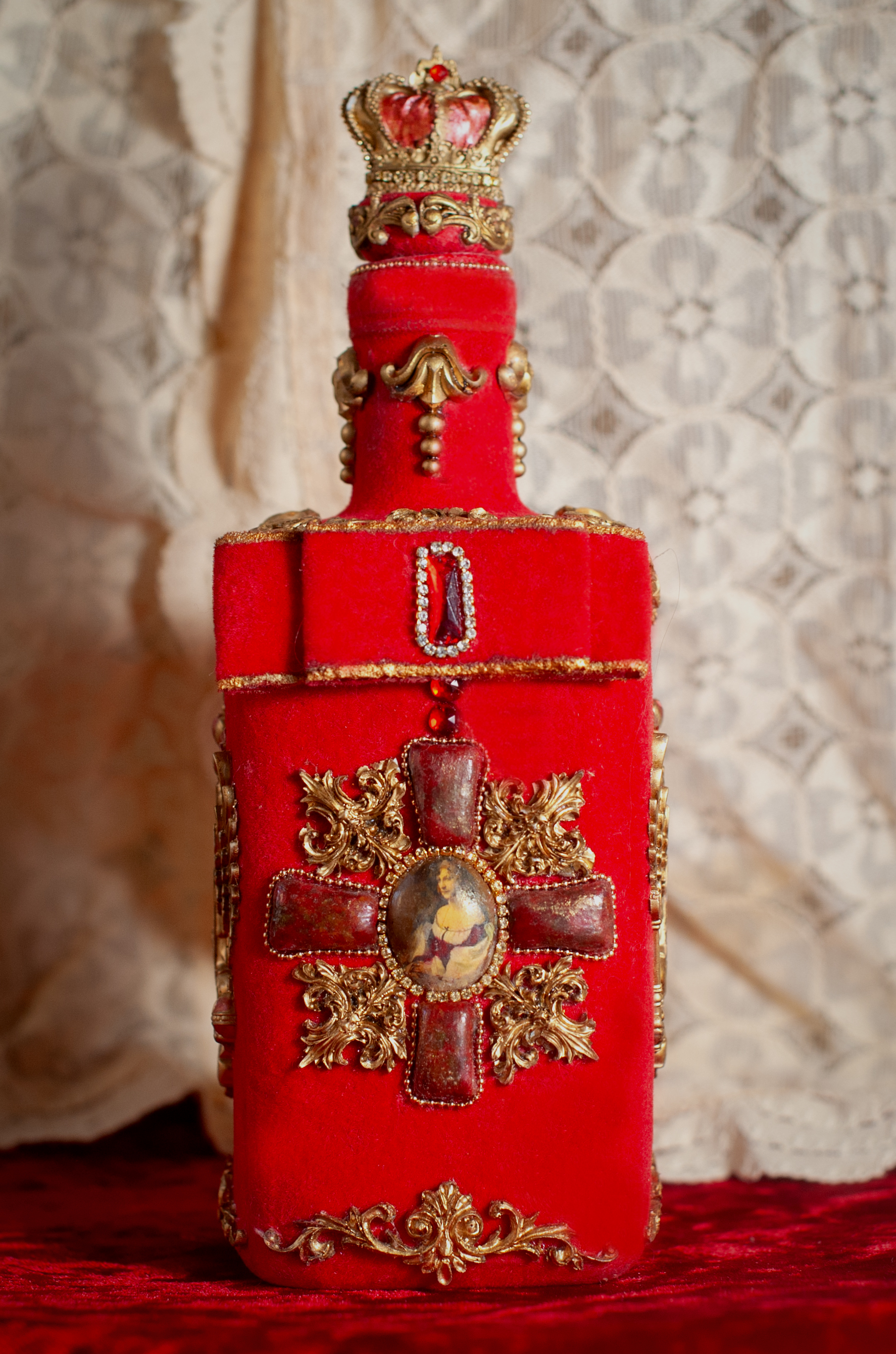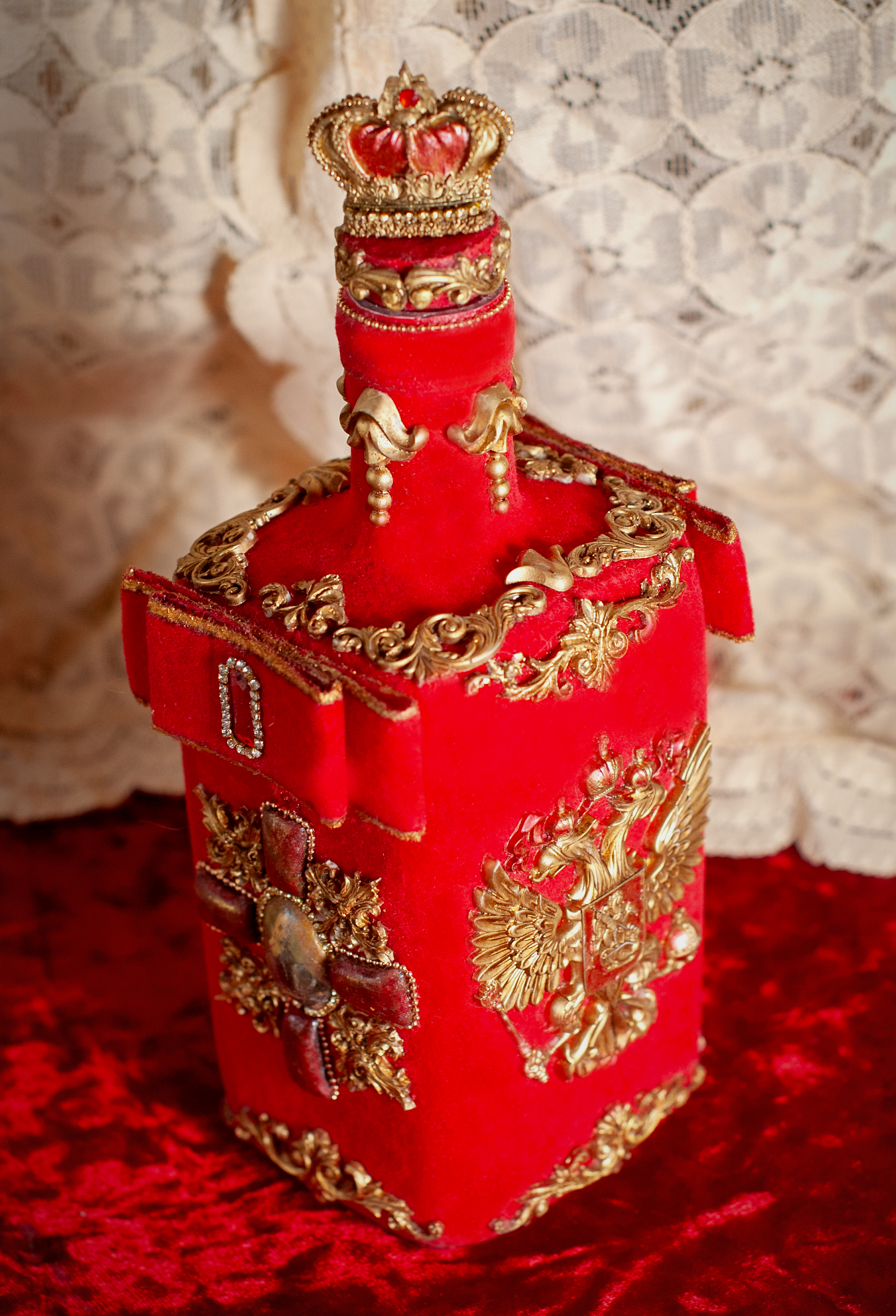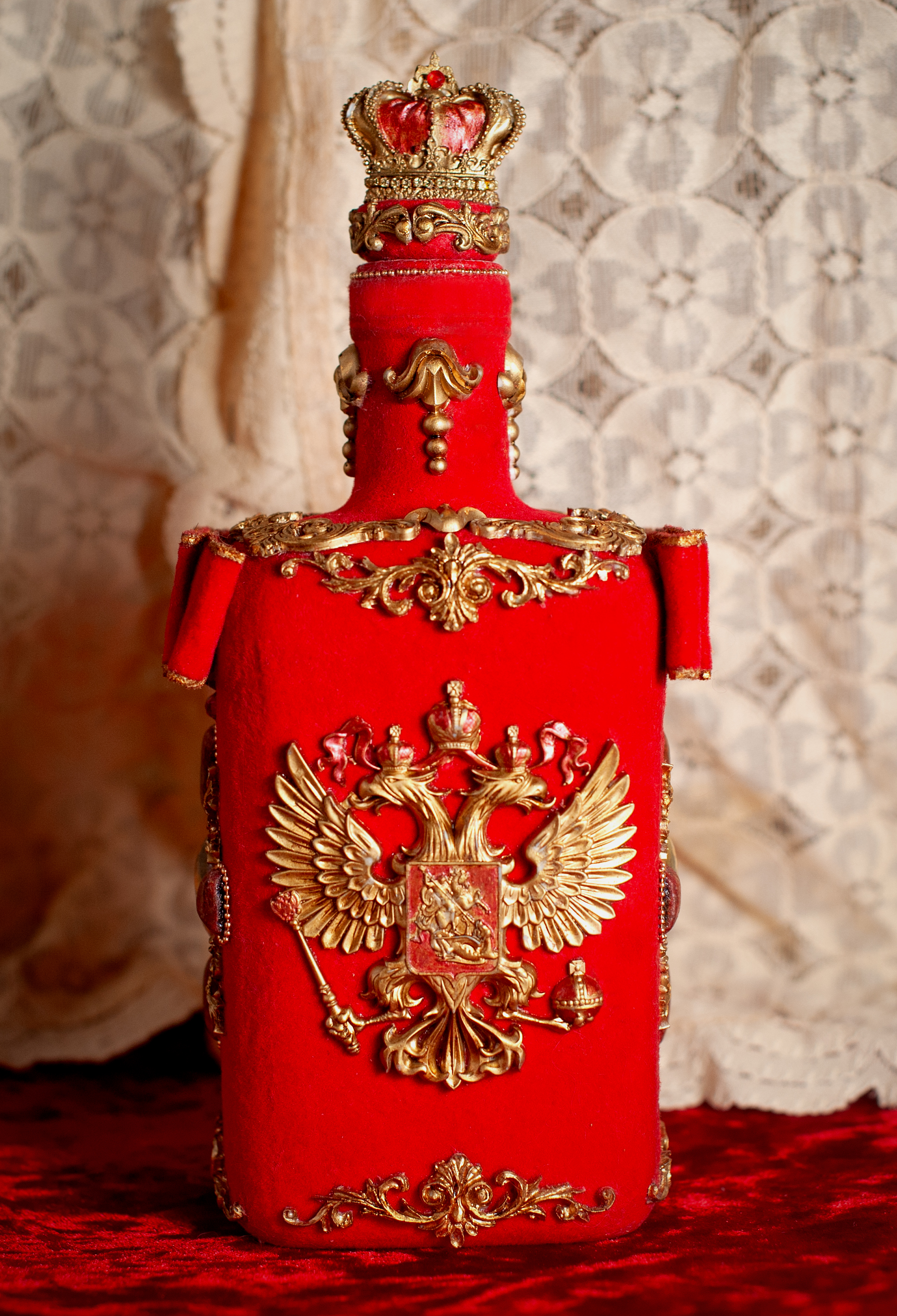И декор с двух сторон двуглавый орёл и с других двух сторон Георгиевский крест в технике имитация камня и венчает бутылочку корона Российской Империи и как дополнение украшена стразовой, и шариковой цепочкой.