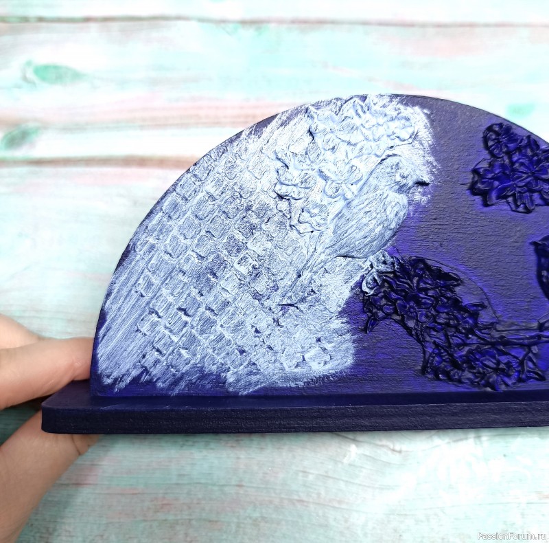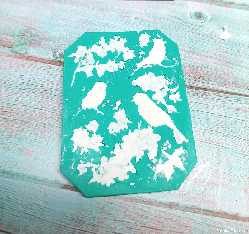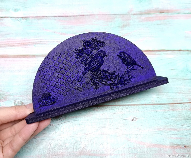Итак, обычную заготовку грунтуем и наносим рельеф - шпатлевкой через трафарет графический фон, из массы для лепки на молде отминаем птичек и цветы. Приклеиваем на ПВА.