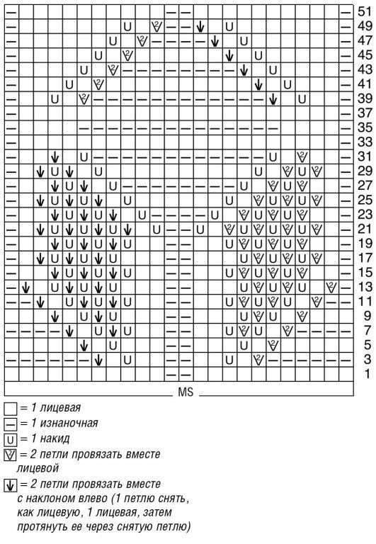 Круговые ряды (число петель кратно 24) = вязать согл. схеме. На ней даны нечетные круговые ряды. В четных круговых рядах петли провязывать по рисунку, накиды провязывать лицевыми. Раппорт постоянно повторять. Выполнить 1 раз 1—50-й круговые ряды.