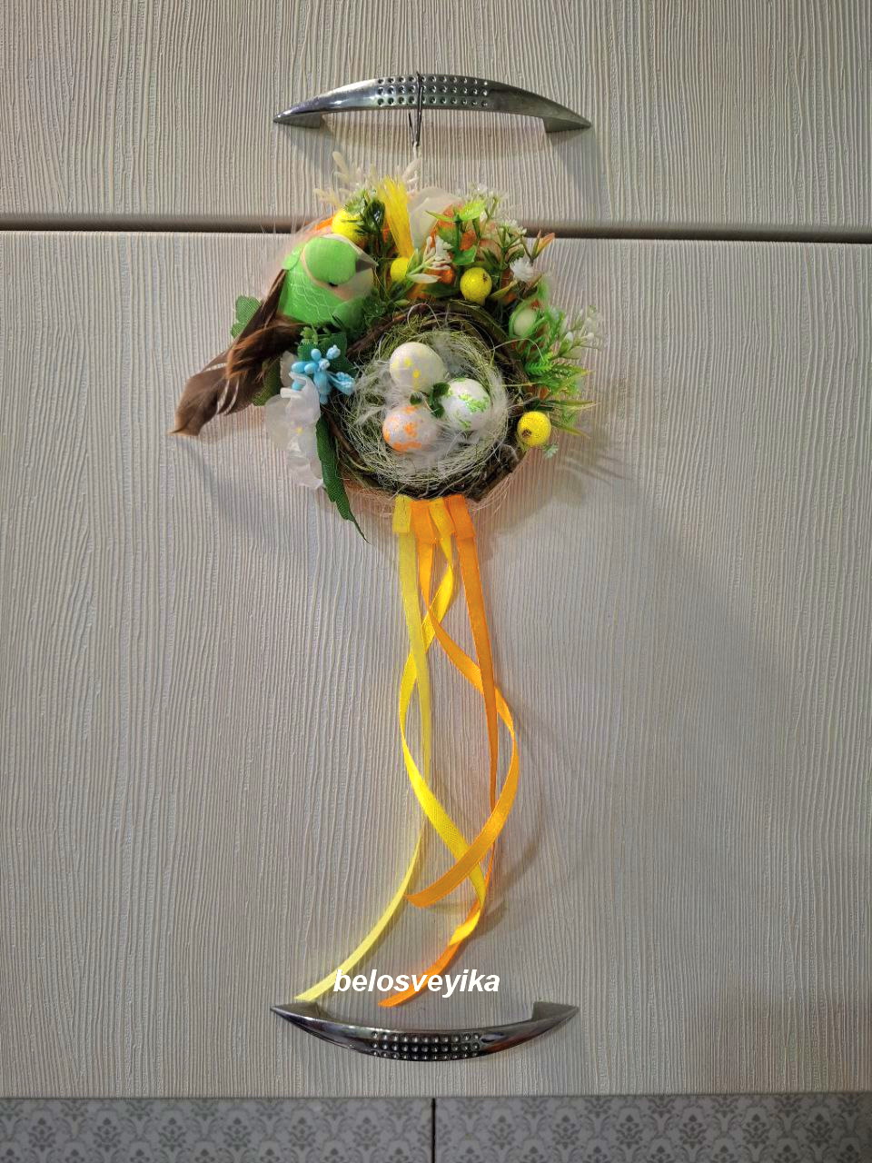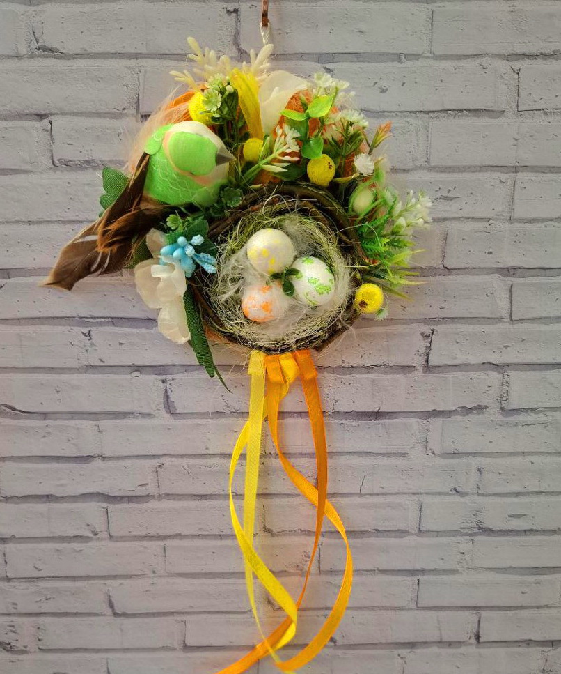 Пасхальный подвес представляет собой круглую основу, на которой находится гнездо с декоративными яйцами, птица, цветы, веточки, перья, ленточки.