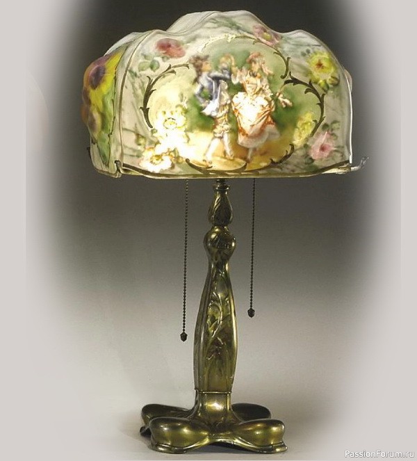 Настольная лампа с плафоном «Torino» с изображением танцующей пары, стекло с обратной росписью, патинированный металл, Pairpoint Mfg Co, начало ХХ века.