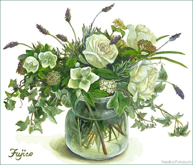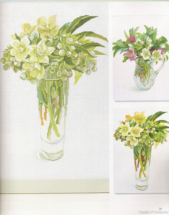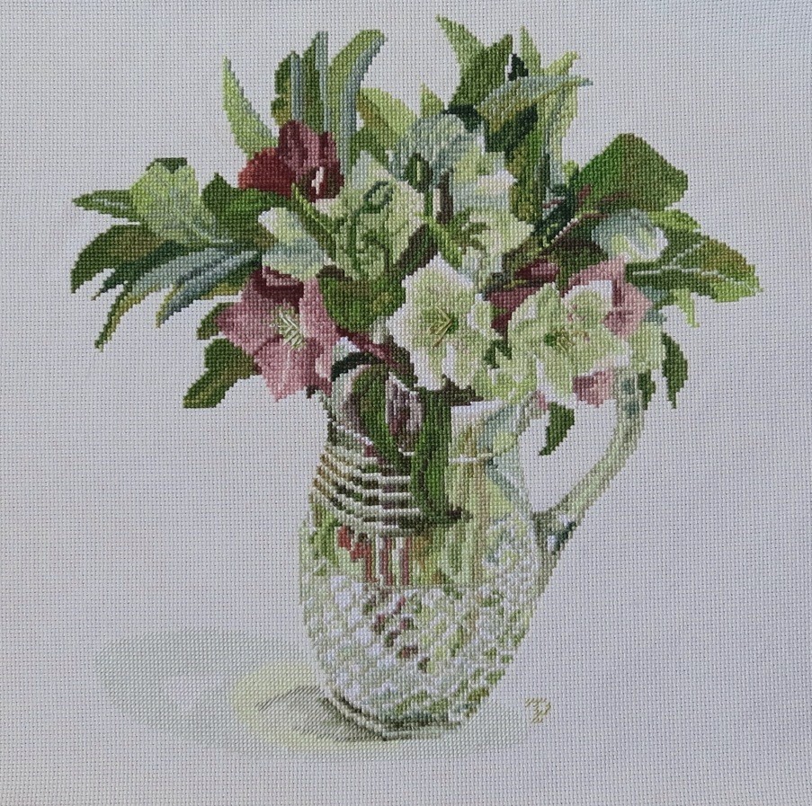 Нежный букет и мне очень понравилась ваза — кувшин, реально " живая ", и даже тень такая аккуратненькая, она не часто встречается в схемах. А много оттенков зеленого делает листик живым, интересным. Никогда не видела картины этой художницы и не слыхала даже, поэтому спасибо и за знакомство с художницей. Татьяна, а где вы покупали такое мулине?