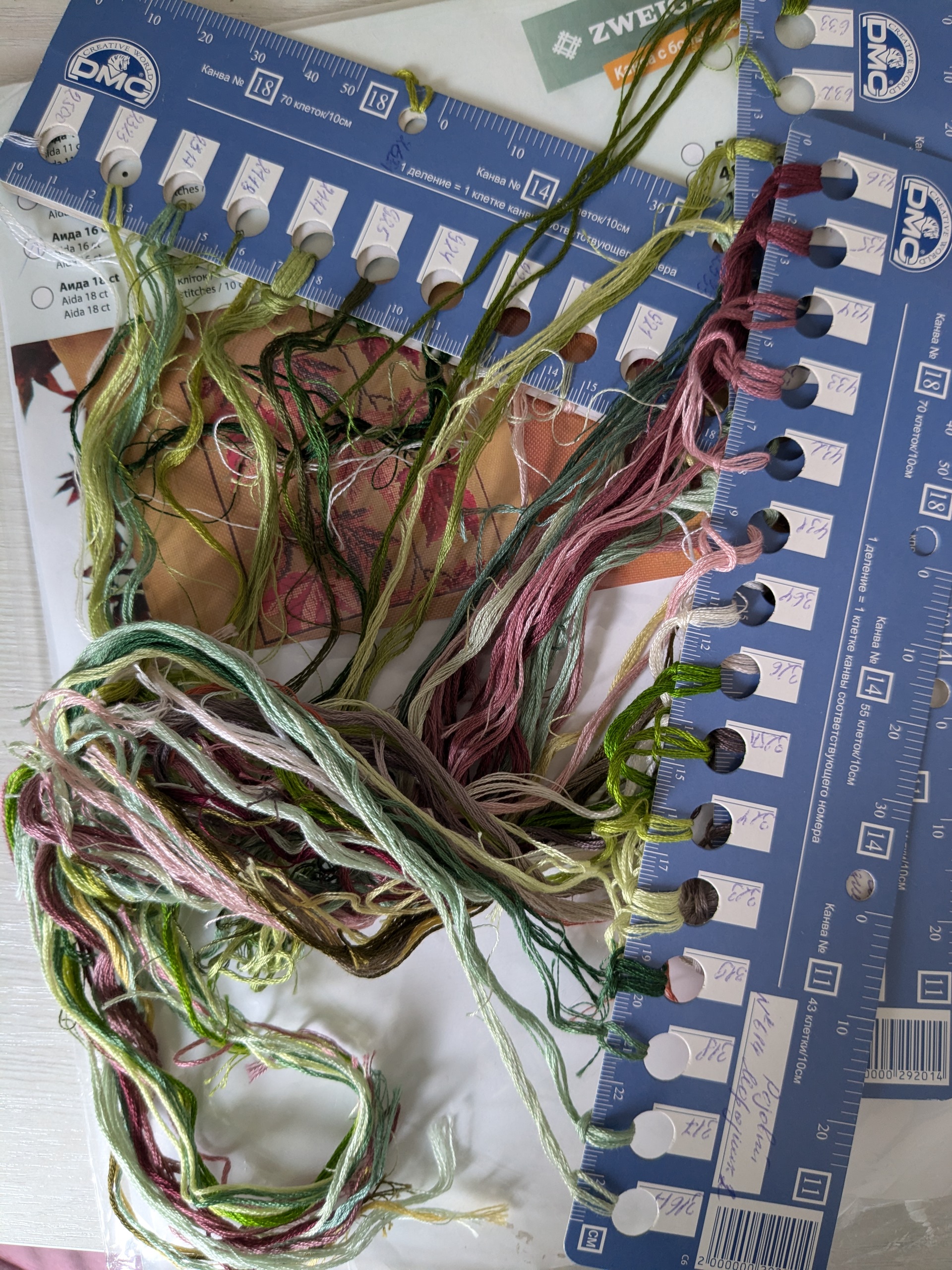 В работе использовала японское мулине Cosmo с чудесным шелковистым блеском. Подбирала по ключу и заказывала нарезку специально к этому проекту. В работе было 80 цветов чистых и 11 смешанных. Вышивать интересно и несложно. Схема проработана до мелочей. Единственное, что напрягало - большое количество оттенков как зеленого, так и розового цветов.