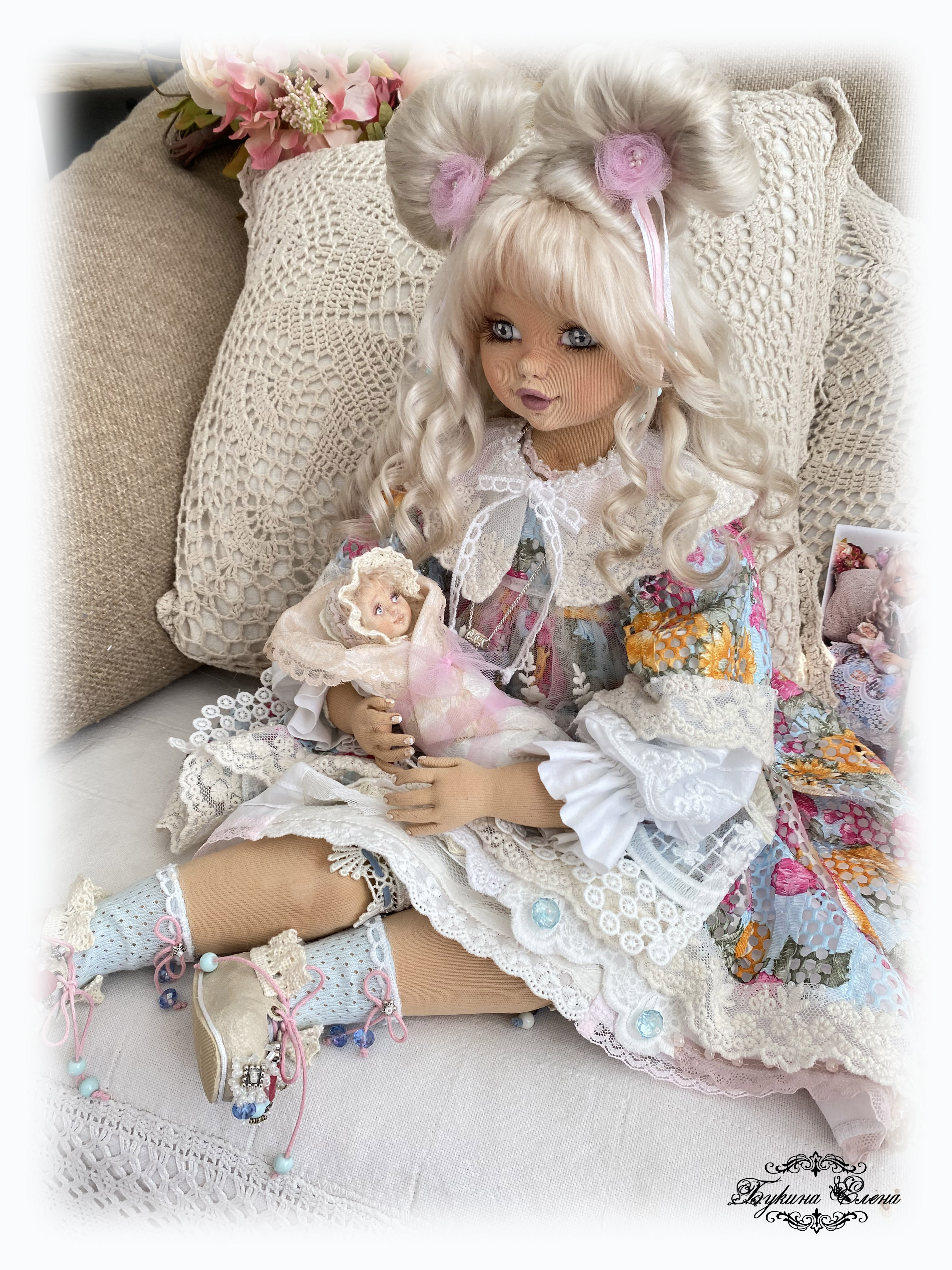 Знакомьтесь, Мия. Коллекционная текстильная кукла. Малышка сшита из хлопка, обтянута трикотажем. Личико объёмное. Девчушка вся подвижная. Головушка крутится и немного наклоняется. Ручки и ножки крепятся, как у будуарных кукол или куклы-болтушки. Миичка стоять не хочет, зато она умеет красиво сидеть и мило складывать ручки. Пальчики на ручках гнутся, есть маникюр, педикюр. Волосы — натуральная козочка, очень мягкие, можно аккуратно расчесывать, закручивать, менять прическу. Вся одежда съёмная, кроме комбинезона. Одежка сшита из хлопка, батиста, украшена кружевом, бисером. Туфельки из натуральной кожи. Арома-кулончик добавляет образ куколки. В кулончик можно добавить любимый аромат. У Миички есть маленькая лялечка. Рост куколки около 55 см. Паспорт прилагается.