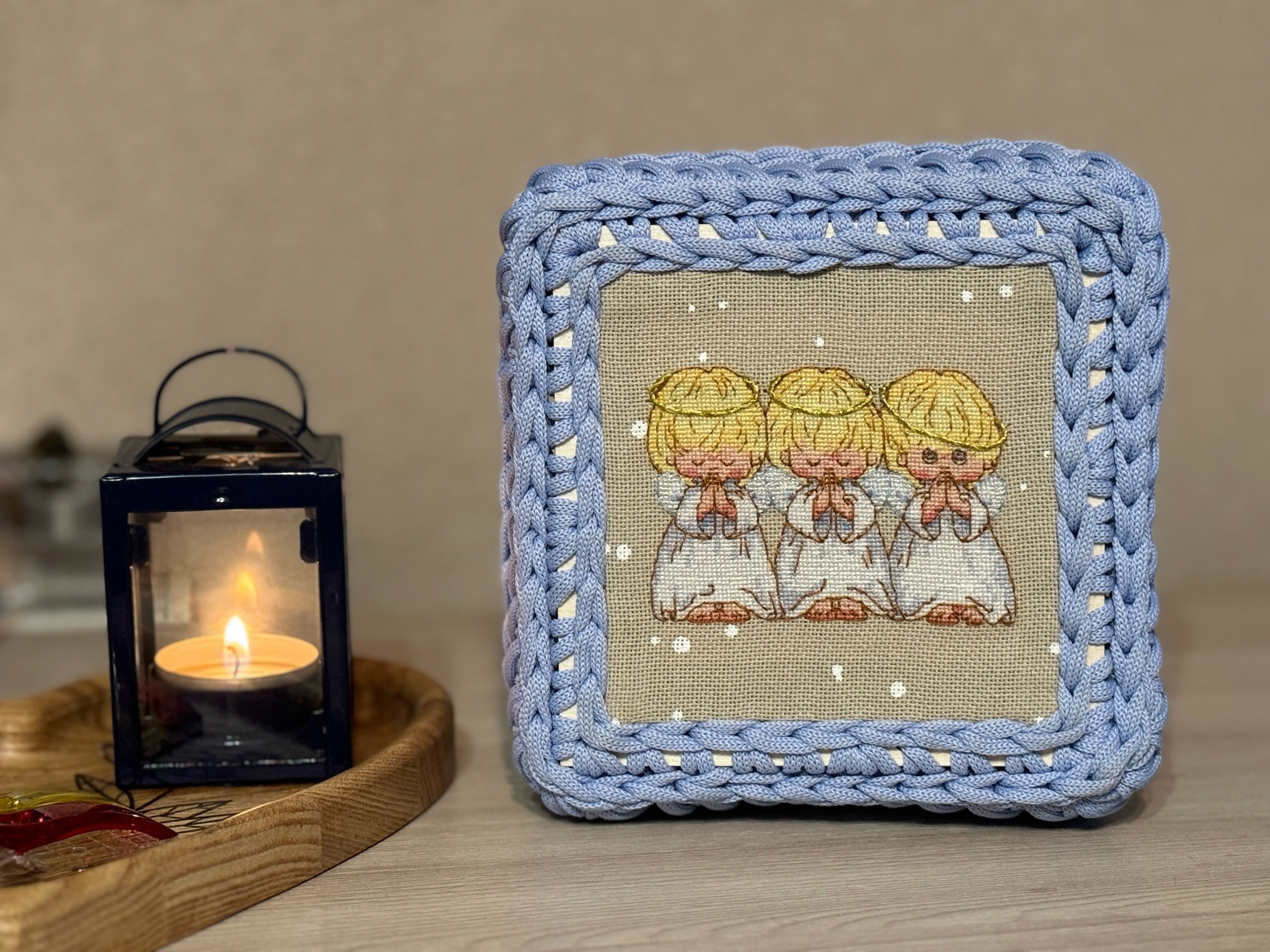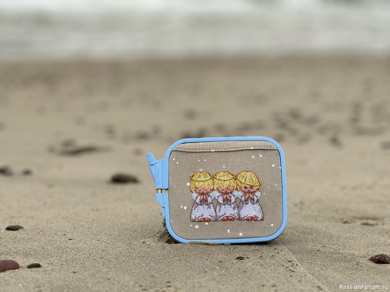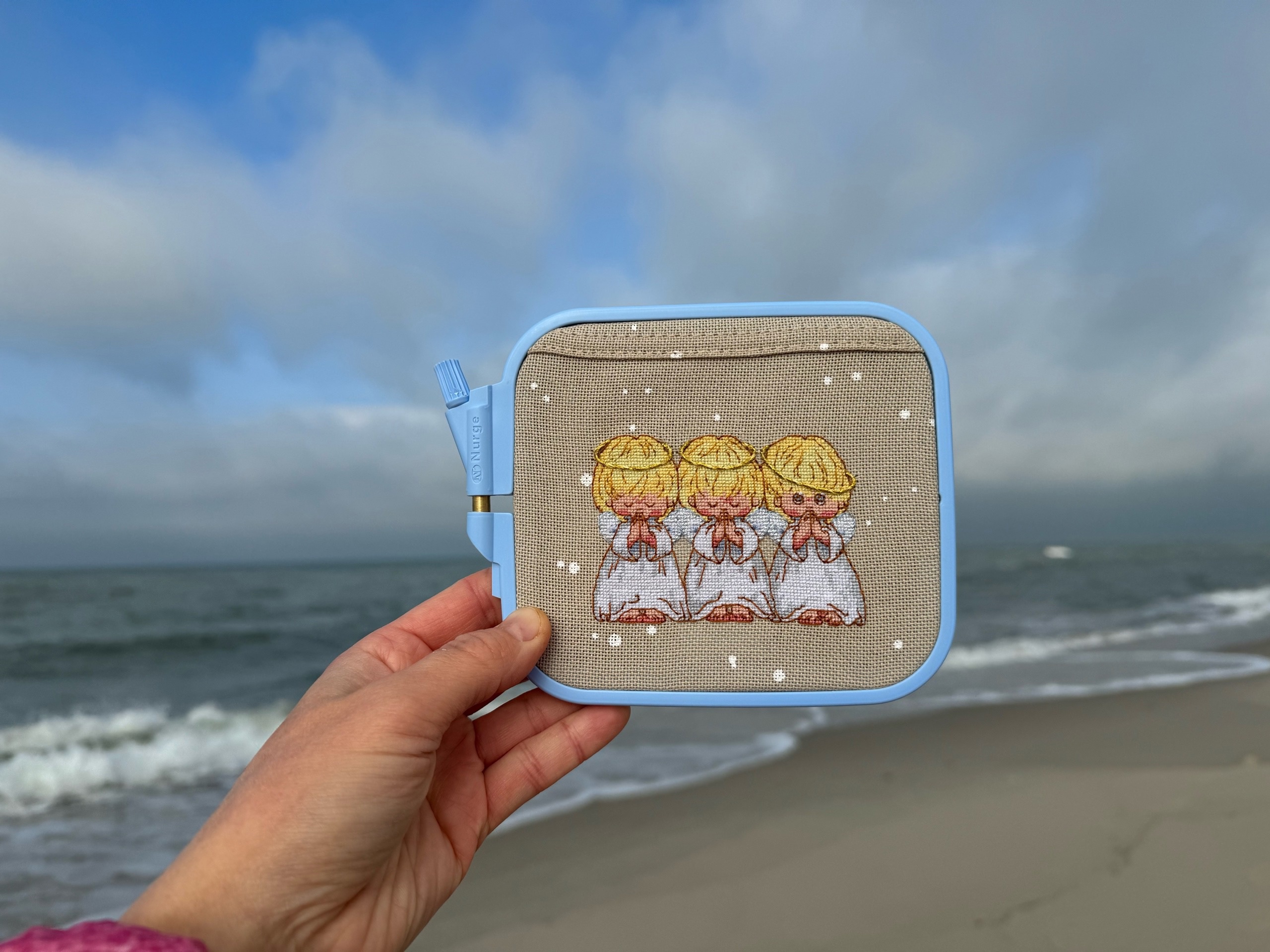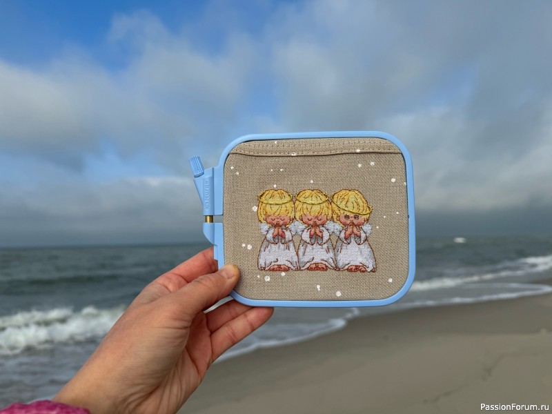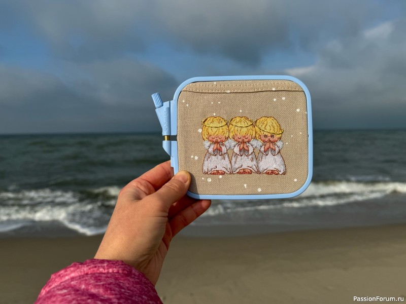 Вышивала ангелов по реплике схемы от Dimensions "Почти идеальный". Оригинал давно снят с производства. Но в интернете есть неплохие схемы, по которым можно вышить. Нитки подбирала сама. Нимбы вышиты золотой ниткой, а в крылья добавлена серебряная нить.