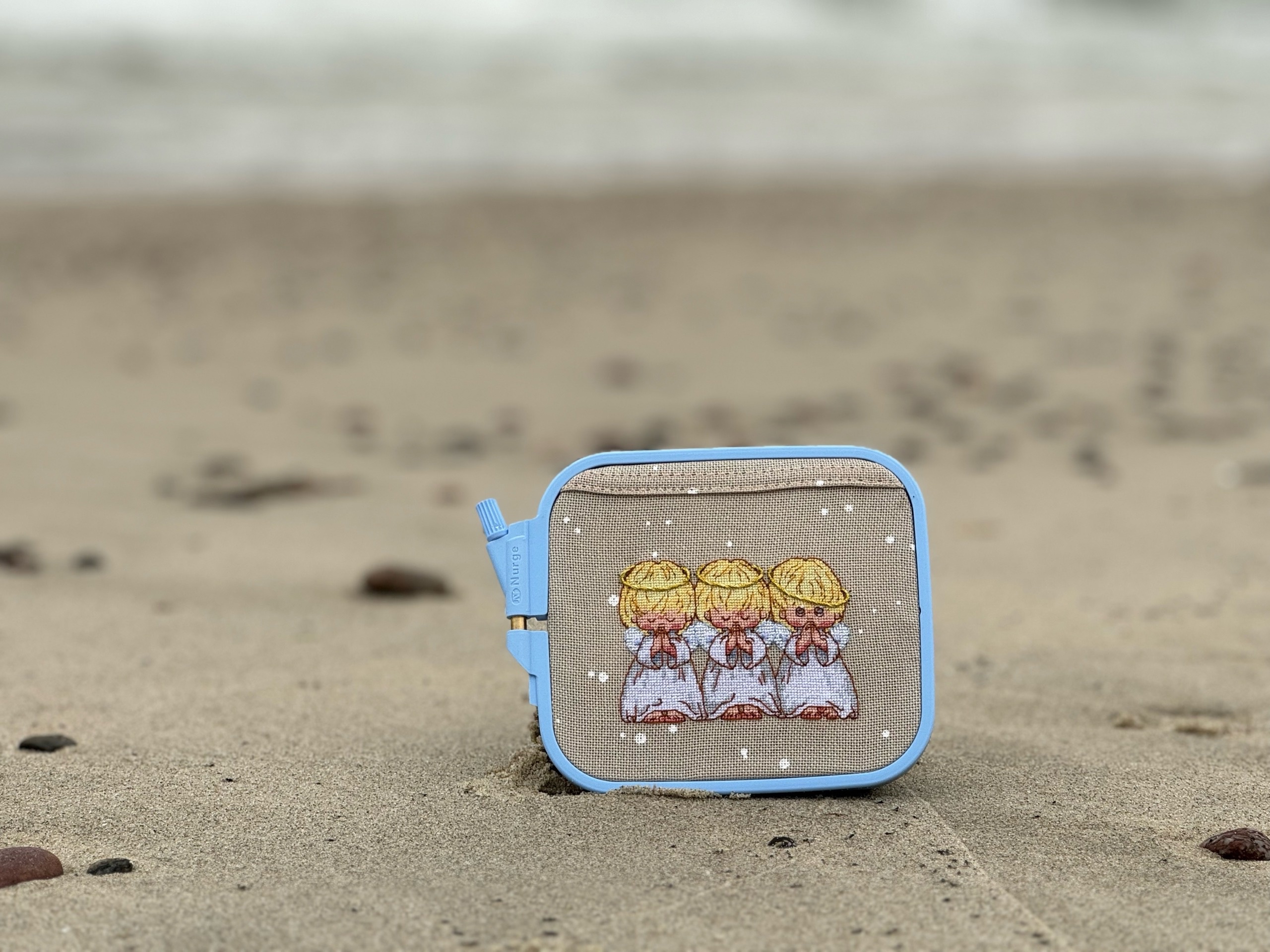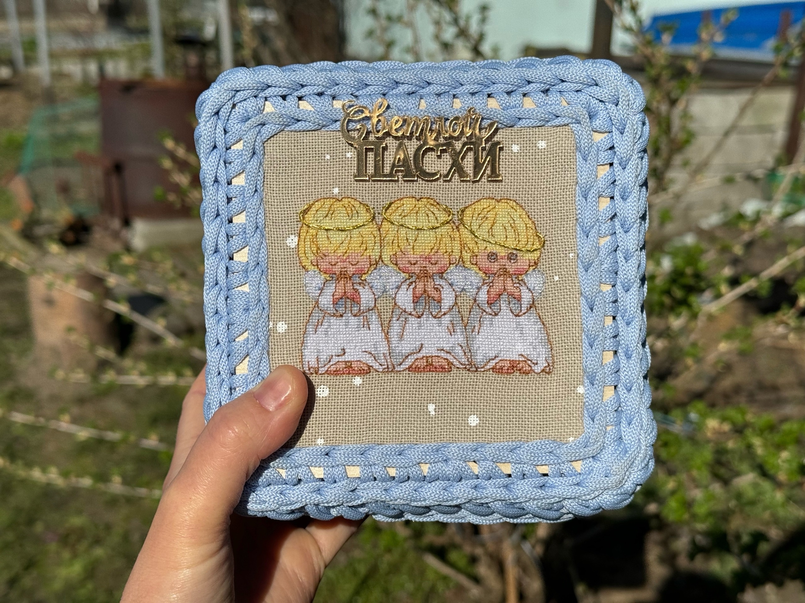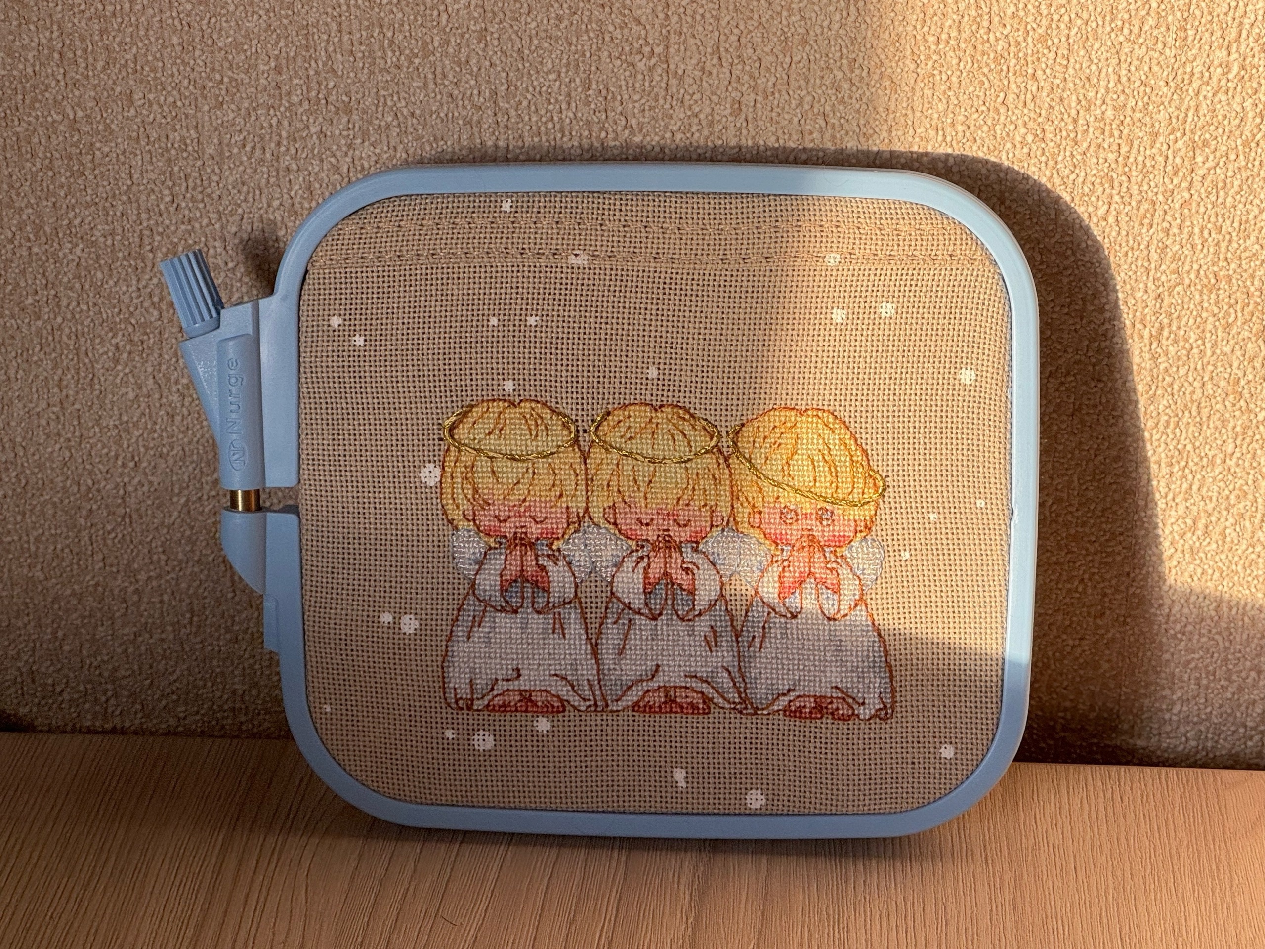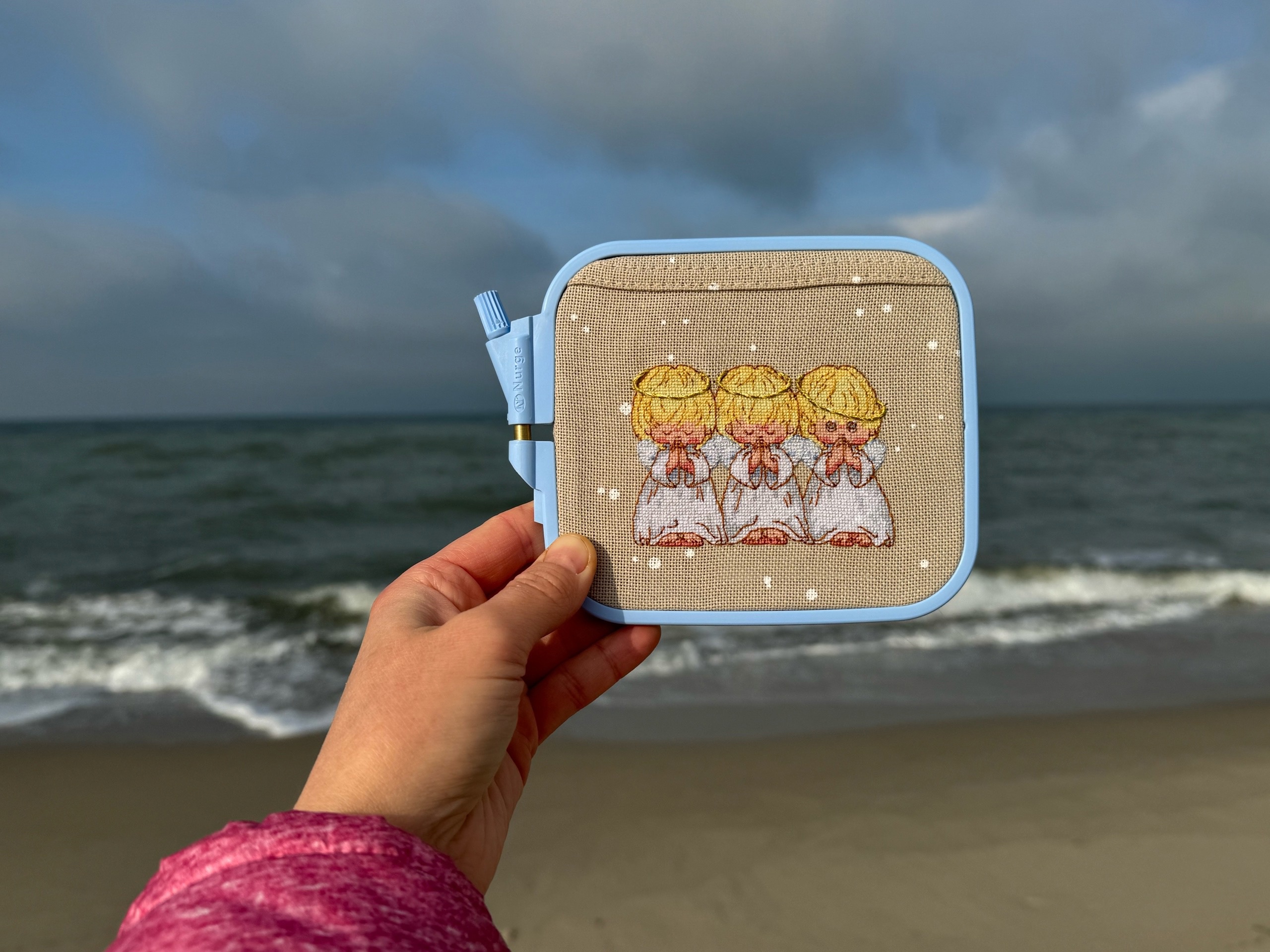 Вышивала ангелов по реплике схемы от Dimensions "Почти идеальный". Оригинал давно снят с производства. Но в интернете есть неплохие схемы, по которым можно вышить. Нитки подбирала сама. Нимбы вышиты золотой ниткой, а в крылья добавлена серебряная нить.