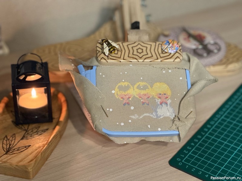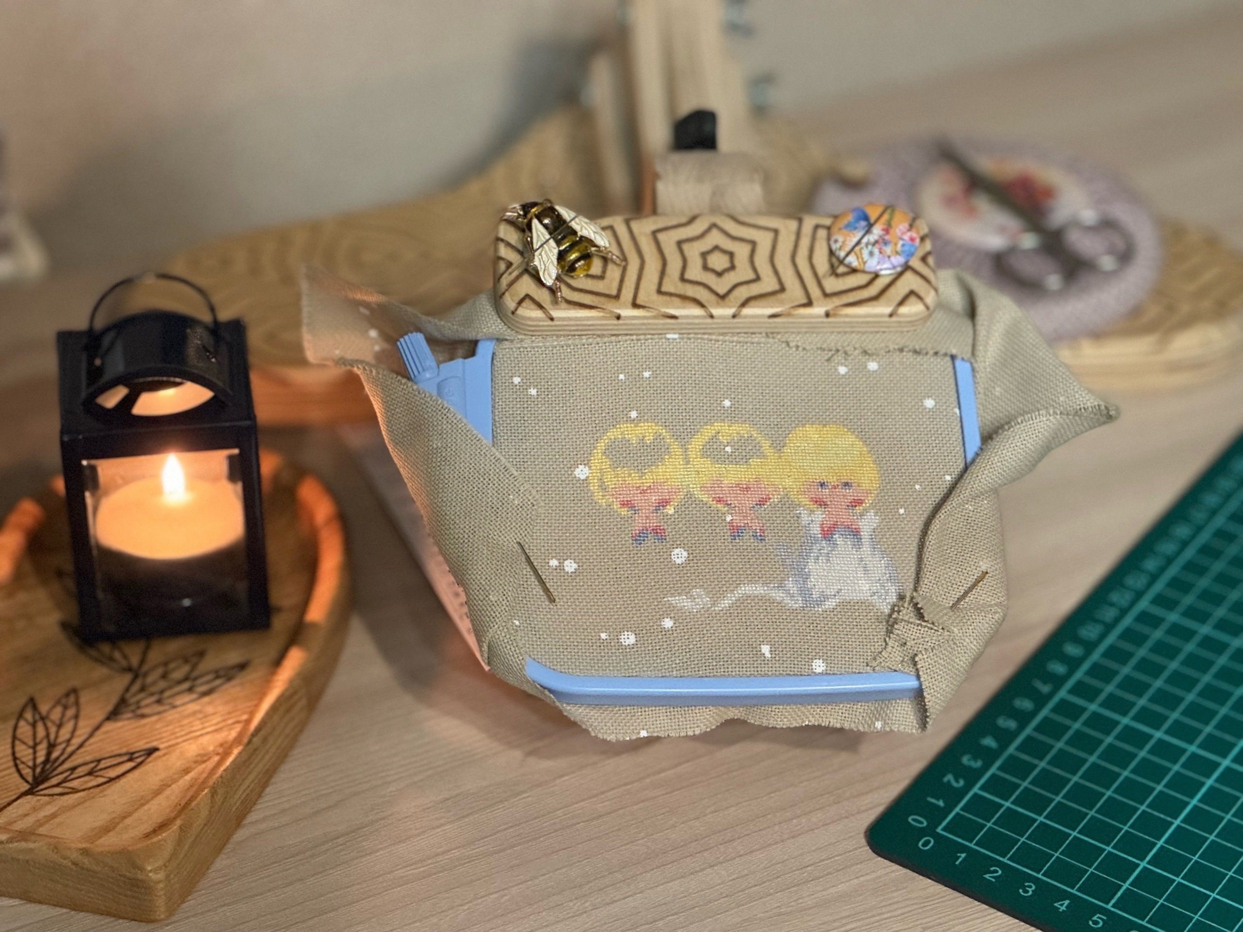 Итак, для работы нам понадобятся: схема, канва, пяльцы, нитки, ножницы, нитки для вязания коробочки, деревянные основы (2 штуки), украшения.