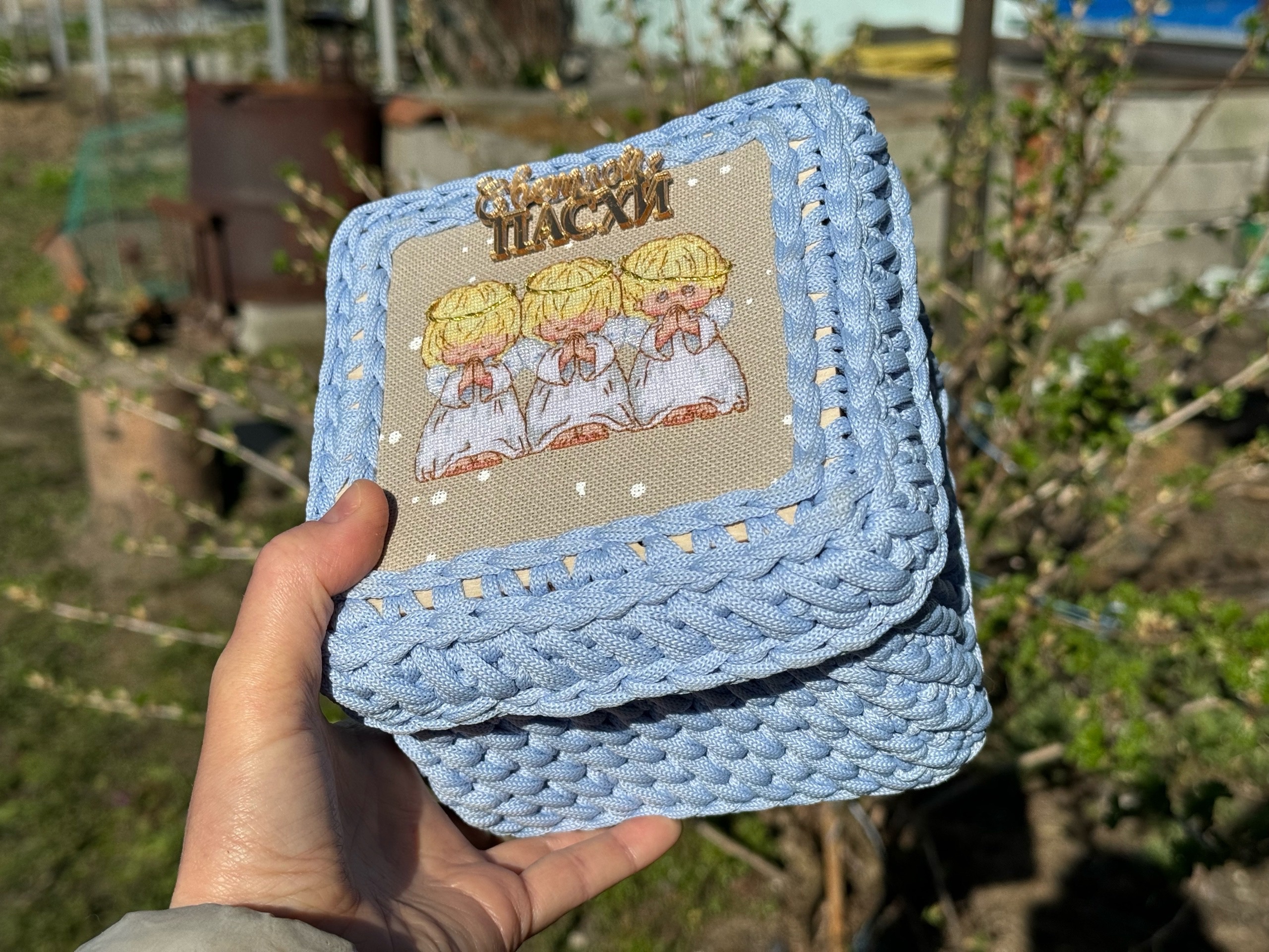 Сегодня хочу показать пасхальную коробочку и рассказать как её сделать) Дно и крышка — деревянные основы для вязания таких коробочек. Крышка была без рисунка, деревянная. Я решила украсить её вышивкой. Техника вышивки — гобеленовый шов. Канву взяла равномерного переплетения, 27 каунта. Размер готовой корзиночки 15 х 15 х 10 см. Чем больше каунт канвы, тем крупнее получится вышивка, учитывайте этот момент.