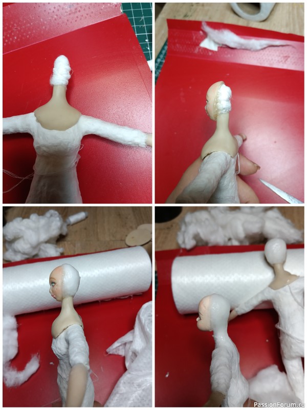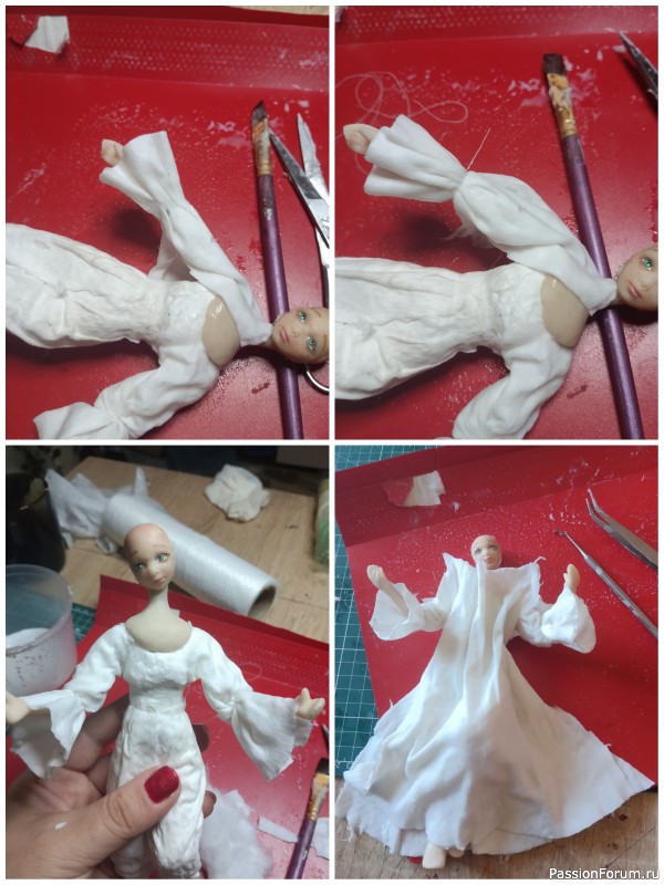 На фото ниже, видно как я привязала полотна к ангелу. Потом обрезала сверху все ненужное и при помощи стека сформировала складки лифа. Пока работала с платьем, ручки я предварительно смазала клейстером, чтобы стали подвижными и при окончании формирования платья, придала им ту форму, которую хотела. И опять возвращаюсь к маленькому ангелку, прикладываю полотно и формирую платье, где нужно подрезаю, где нужно формирую складки. И на просушку обоих ангелов.