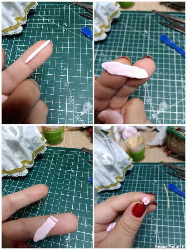 Теперь делаю цветочки для венка из флористической глины(можно заменить на воздушный детский пластилин). Скатываю тоненькую колбаску, затем сплющиваю и с одной стороны истончаю, и скручиваю как на фото ниже. Лишнее снизу обрезаю. И так, столько цветочков, сколько на мой взгляд нужно и сушу.