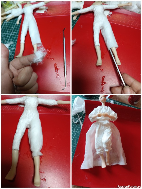 Где получились стыки, их маскирую прозрачными, маленькими кусочками ваты, примазываю в этих местах. Потом при помощи стека (можно взять шпажку, ручку от кисти) расправляю штанину и затем внизу стягиваю швейной нитью. Как на фото ниже. Таким же образом одеваю вторую ножку.