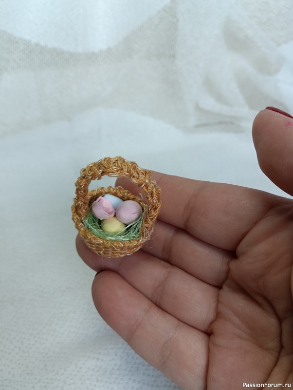 Приклеиваю полимерным клеем к венку. Потом леплю четыре маленьких яйца из флористической глины (можно заменить на детский воздушный пластилин, одно и тоже) и одно яйцо побольше. Вяжу корзинку. В КА 6 ст.б.н. Далее вяжу круг амигуруми до 24 п. Затем 5 рядов без изменений за заднюю стенку. В шестом ряду делаю прибавку, 12 ст.б.н., пр., 12ст.б.н. Седьмой ряд обвязываю "рачий шаг". Ручку вяжу шнуром. Девочки в интернете много описания разных шнуров, тут не вставляю схему т.к. боюсь, что опубликуется ли у меня топик вообще, он уже получился у меня как бесконечная простыня