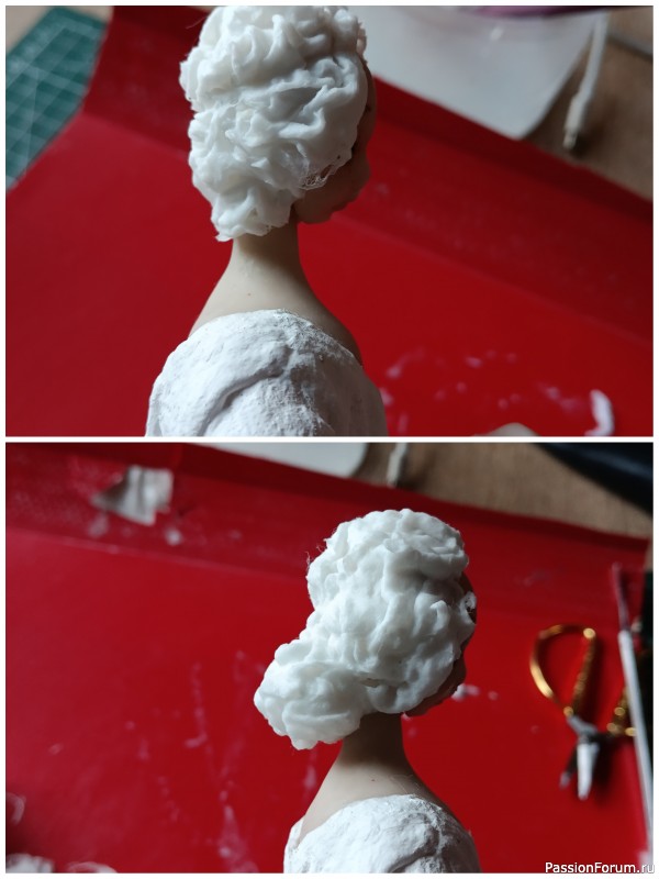 Затем, где должна быть голова, наматываю немного ваты, промазываю клейстером и приклеиваю при помощи клеевого пистолета личики, так, как я это задумала. Далее наращиваю, как и тела, объемы головы. Опять сушу. Смотрите фото ниже. На этом этапе, можно использовать не самую лучшую вату, мне тут идеальная ровность не нужна))