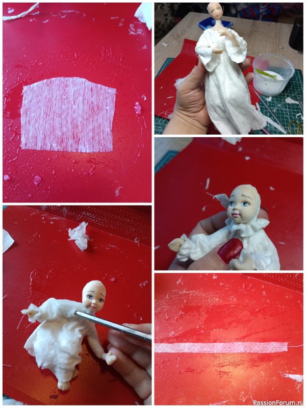 У большого ангела формирую подол платья, несколько раз, смазываю, формирую сушу, после сушки, если, что то не нравится, опять смазываю, формирую и т.д пока не добьюсь нужного результата. А маленькому ангелу начинаю одевать рукава. Принцип один и тот же, как я описывала выше, смотрите фото ниже. Далее маскирую шейку у маленького ангела. Отрезаю полоску салфетки, вату тут я не накладываю, а промакиваю эту полоску в клее ПВА не разбавленном, и делаю на шее складочки, сушу. После сушки, воротник снимаю, он не приклеится, если его не поддержать кусочками ваты. И уже сухой приклеиваю на полимерный клей, можно заменить клеем "Момент" кристалл или гель.