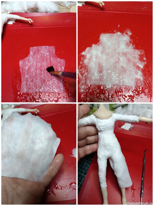 Теперь начинаю одевать, уже качественной ватой. Начинаю с панталончиков. Так, как мои ангелы будут одеты в "легкие" одежды, для этого беру нетканые салфетки. примеряю, крою. Затем смазываю подложку клейстером, кладу выкройку из салфетки, хорошо пропитываю и сверху ложу тонкий пласт ваты и опять тщательно промазываю клейстером, помогаю пальцами выгонять воздух, делаю это так, пока вата не начнет просвечивать подложку. Если вижу, что где то ваты меньше, докладываю кусочки и промазываю. Можно эту манипуляцию делать поэтапно, положили кусочек, примазали и опять положили кусочек и т.д. пока не заполнится вся выкройка. Потом я беру это получившееся полотно на ладонь и обрезаю выступившую вату за края выкройки, т.е. по контуру салфетки. И одеваю одну ножку, как на фото ниже. Где по сути должен идти шов штанины, там накладываю полотно друг на друга. Кстати, нижняя сторона, т.е. сторона с салфеткой, это будет лицевая сторона одежды))
