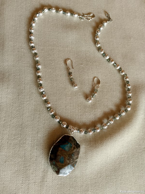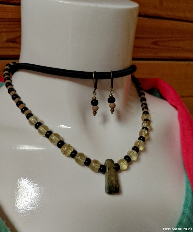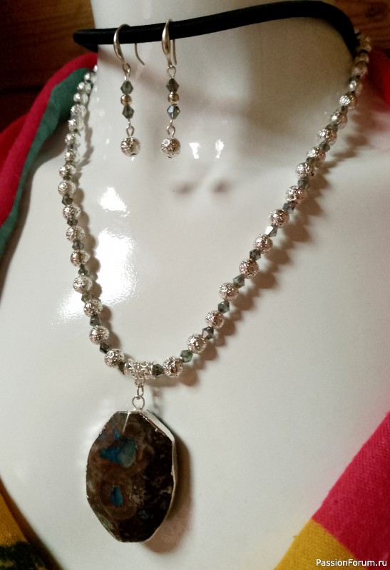 Тут много разномастных материалов: черепаховая яшма, посеребренная лава и блестящие акриловые граненые бусины дымчатого цвета. Цвета довольно сложносочетаемые и все же.. мне нравится финальный результат.