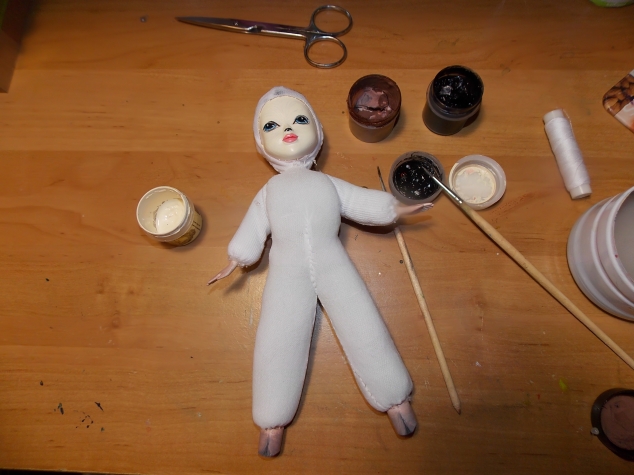 Материалы: кукла, проволока для каркаса, синтепон, малярный скотч,суперпух (шарики), белые капроновые колготки, акриловая краска, белый атласный материал, ажурная тесьма, бижутерия