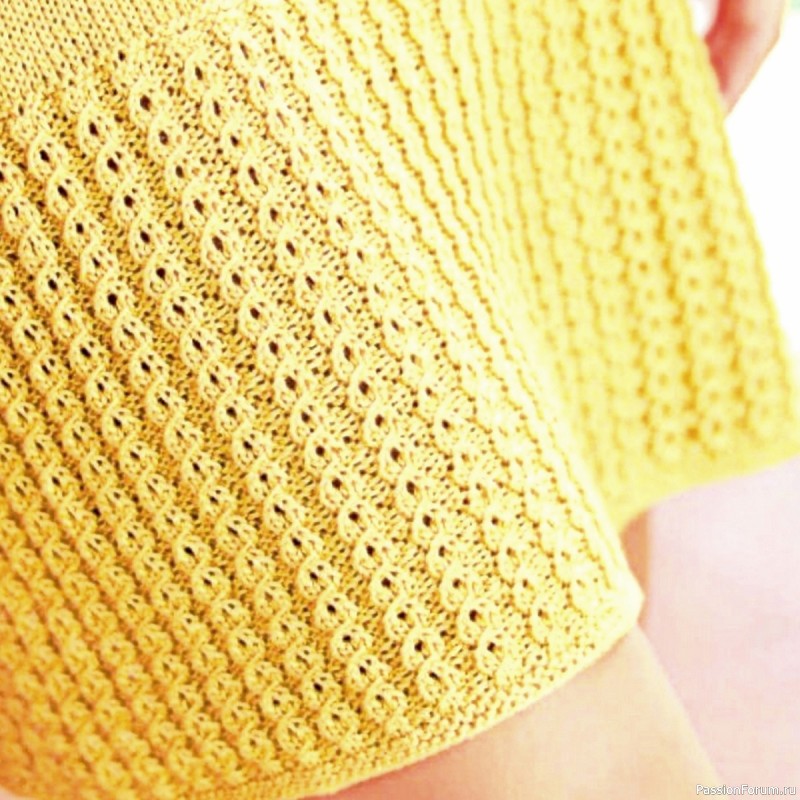 Внимание! В 4-м р. каймы равномерно прибавить 62 (65) 70 п., вывязав их скрещенными из протяжек = 340 (365) 390 п. В 79-м круг. р. каймы равномерно убавить столько же петель, для этого 62 (65) 70 раз провязать вместе по 2 п. = 278 (300) 320 п. После последнего ряда каймы все петли закрыть лицевыми.