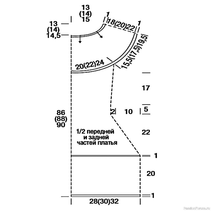 Внимание! Изделие вязать круговыми рядами сверху вниз от горловины. Стрелками на выкройке обозначено направление вязания.