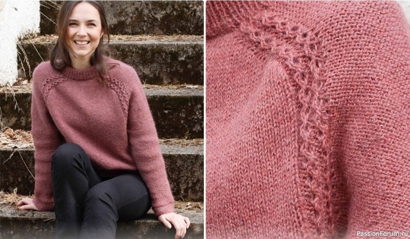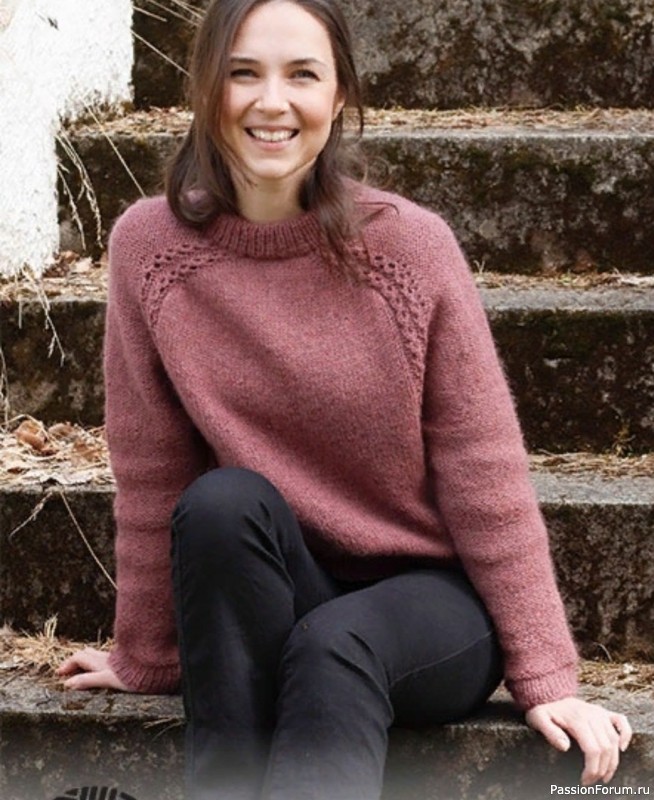 Двойная горловина и кокетка вяжутся по кругу на круговых спицах сверху вниз. Сначала выполняются прибавки для плеча-погона, далее прибавляются петли для рукава. После этот кокетка разделяется на тело и рукава. Тело вяжется по кругу сверху вниз на круговых спицах. Рукава вяжутся по кругу сверху вниз на коротких круговых / чулочных спицах.