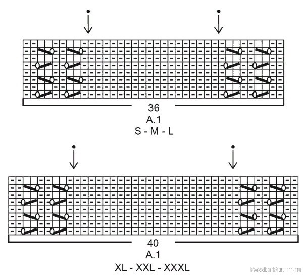 Изделие вяжется лицевой гладью на переде и спинке и по схеме А.1 на 36-36-36-40-40-40 петлях обоих рукавов (между 1м и 2м маркерами и 3м и 4м маркерами).