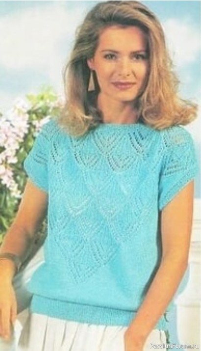 Летняя кофточка вяжется простым прямоугольным полотном. Благодаря отсутствию линии пройм, мы получаем небольшое спущенное плечо, имитирующее короткий рукавчик.