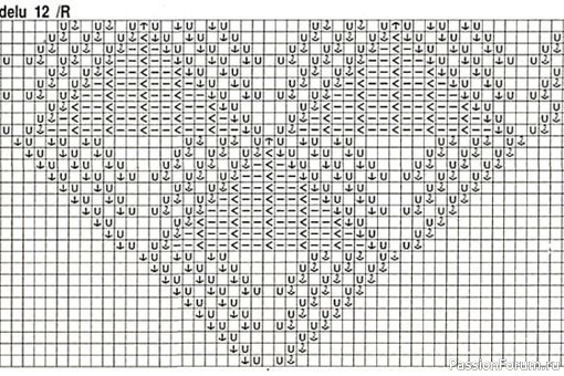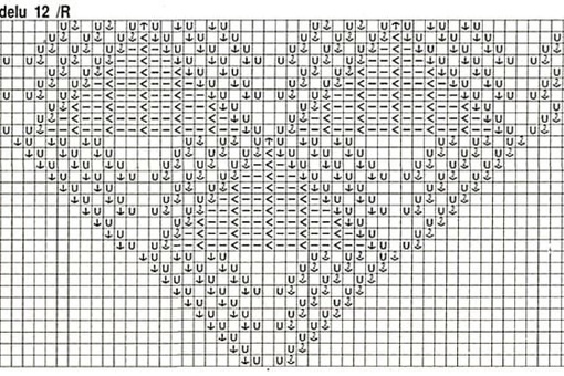 На высоте 14 см от резинки, отметить центральную петлю, и начать выполнение ажурного узора согласно схеме. Петли по бокам вязать лицевой гладью. На высоте спинки закрыть все петли по рисунку.