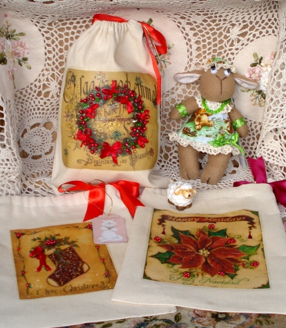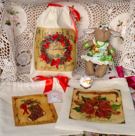 Мешочки для подарков сшиты из ткани двунитки. Рисунки нанесены с помощью термотрансферной бумаги. Оживила их с помощью бусин, ленточек, различных контуров.