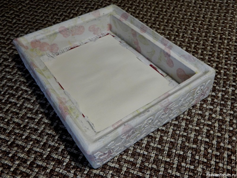 Я еще оклеиваю бортики белыми салфетками, остающимися от трехслойных, для более гладкой фактуры. Украшала рамочку я рисунком через трафарет шпатлевкой. На самом деле украсить можно и наклеив фактурные обои, кружево, отливки и т.д.