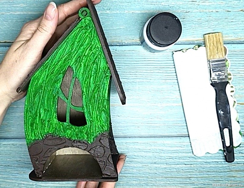 Далее сухой кистью с белым акрилом оттеняем все рельефные узоры на домике: