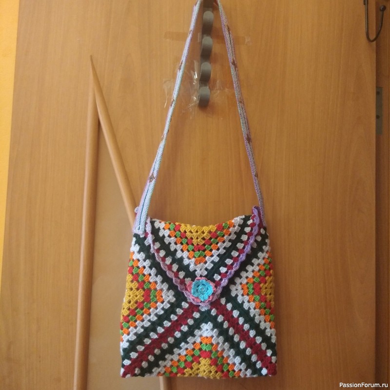 Готовая сумочка. Описание: В основе бабушкин квадрат, мягкая пластиковая канва для ручки, хб и акриловые нитки, плотная ткань для подкладки, авторская отделка- цветочек, кнопка - застёжка. Использован крючок 1,25. швейная игла. Время изготовления 2- 3 недели.