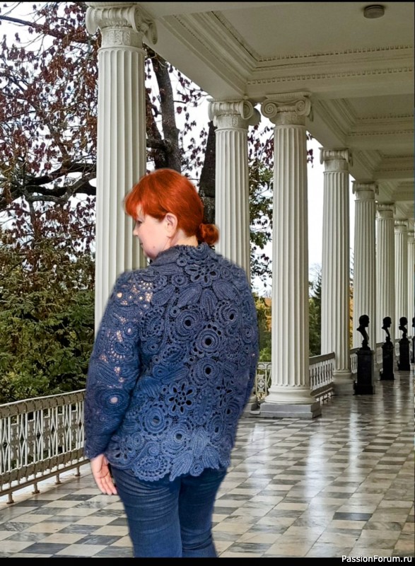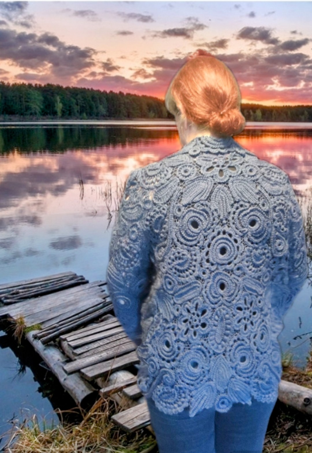 Жакет связан в технике современного ирландского кружева из полушерстяной белорусской пряжи в 8 сложений, сеточка в 4 сложения. Красивый и современный. Элегантный. С анатомически правильной хорошей посадкой. Стильный, модный и красивый.