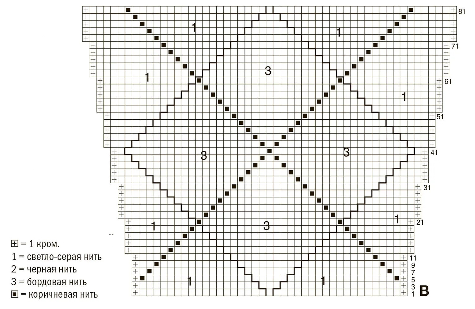 Относится к следующим узорам в технике интарсия: вязать лицевой гладью по счетной схеме нитями от разных клубков, при этом при смене цвета перекрещивать нити на изнаночной стороне работы во избежание образования дырочек. На схеме приведены только лицевые ряды.
