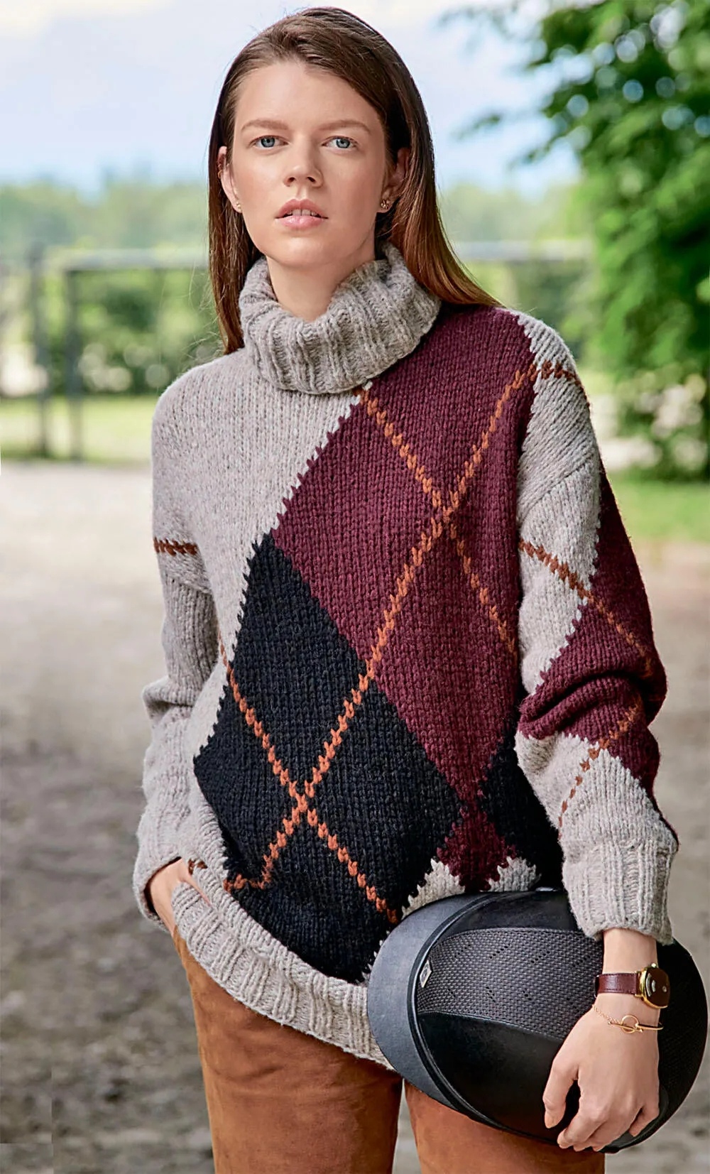 Свободный фасон этого свитера делает его подходящим сразу для трех размеров, а асимметричный узор из ромбов придет модели модное звучание.